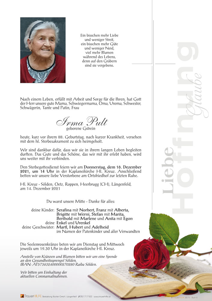 Bestattung wurde durchgeführt von: Daniel Klocker Bestattung Klocker GmbH Oberlängenfeld 41 6444 - Längenfeld Tel.: 05253 5561 zum Bestatter