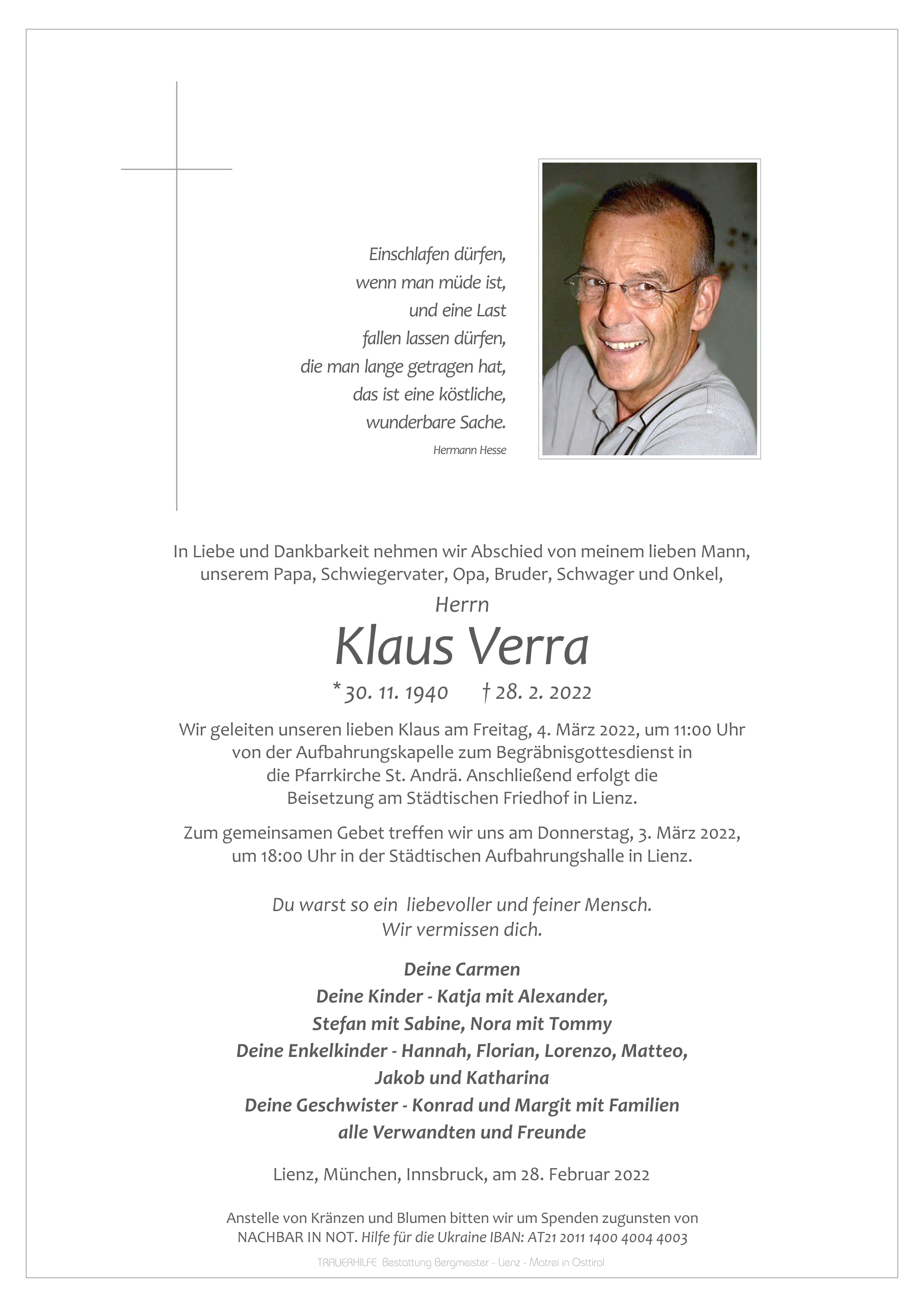 Lieber Klaus ! Du warst ein guter und lieber Freund unserer Familie. Dafür danken wir Dir von Herzen. Deiner Familie und deinem Bruder Conny unser Aufrichtiges Beileid zu dem traurigen Verlust. Wir werden dich nie vergessen. Hannes & Irmi Kostner.