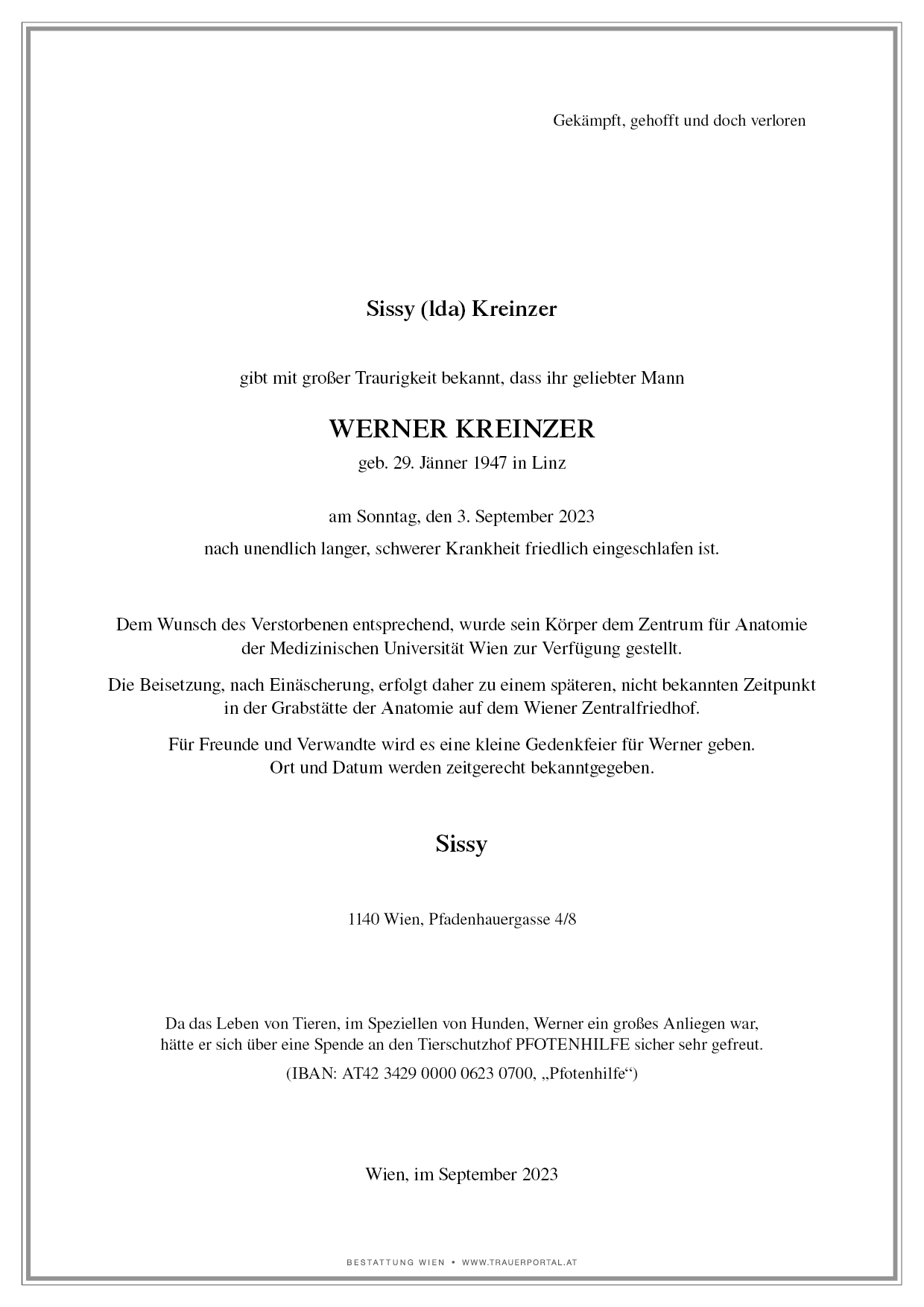 Bestattung wurde durchgeführt von: Bestattung Wien Bestattung Wien GmbH Simmeringer Hauptstraße 339 1110 - Wien (Simmering) Tel.: 01 501950 zum Bestatter