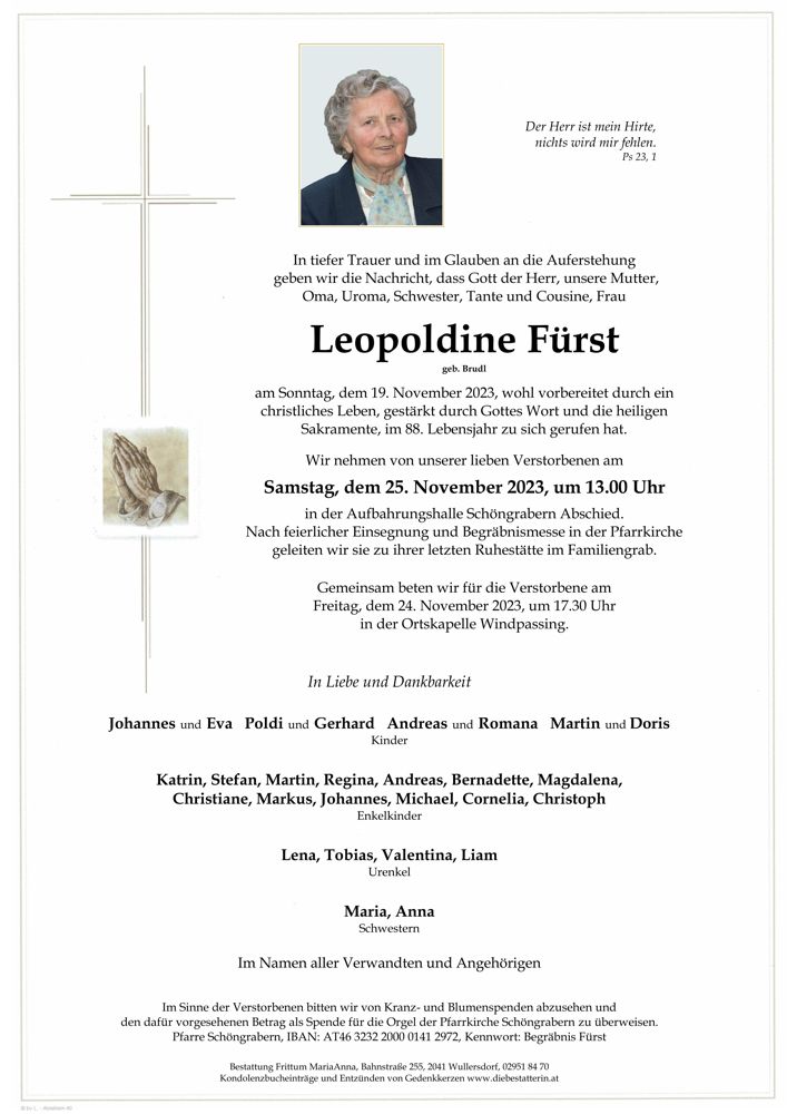 Bestattung wurde durchgeführt von: Frittum Maria Anna TrauerHilfe Bestattung Frittum Bahnstrasse 255 2041 - Wullersdorf Tel.: 050 1717-600 zum Bestatter