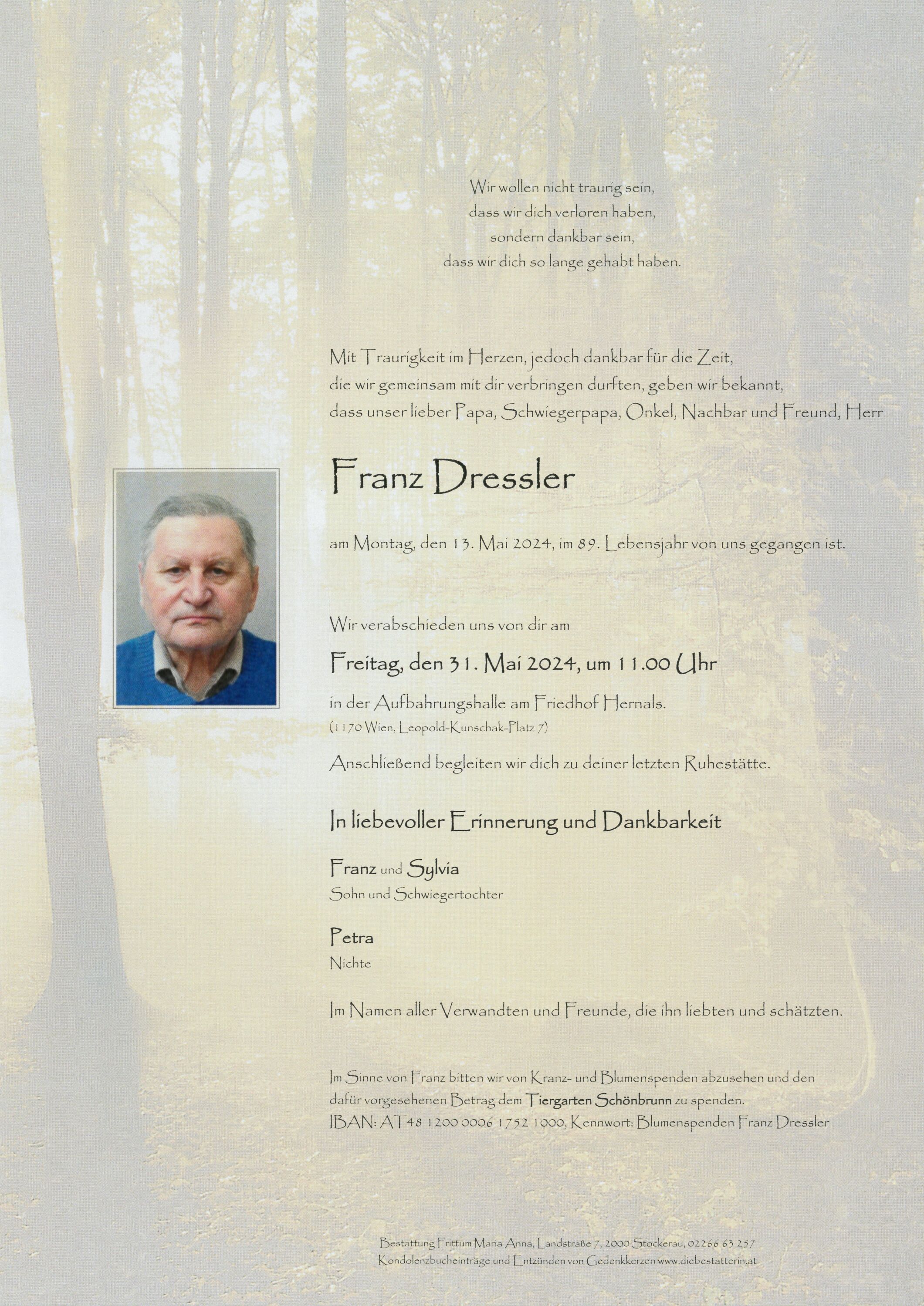 Bestattung wurde durchgeführt von: Frittum Maria Anna TrauerHilfe Bestattung Frittum Bahnstrasse 255 2041 - Wullersdorf Tel.: 050 1717-600 zum Bestatter