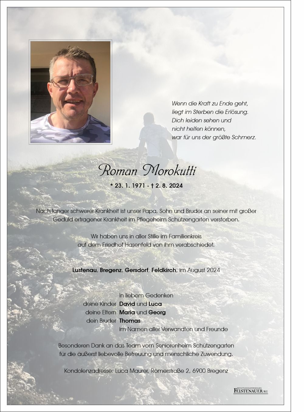Bestattung wurde durchgeführt von: Angelika Matheisl Bestattung Feistenauer Holzstraße 54 6890 - Lustenau Tel.: 05577 87100 zum Bestatter