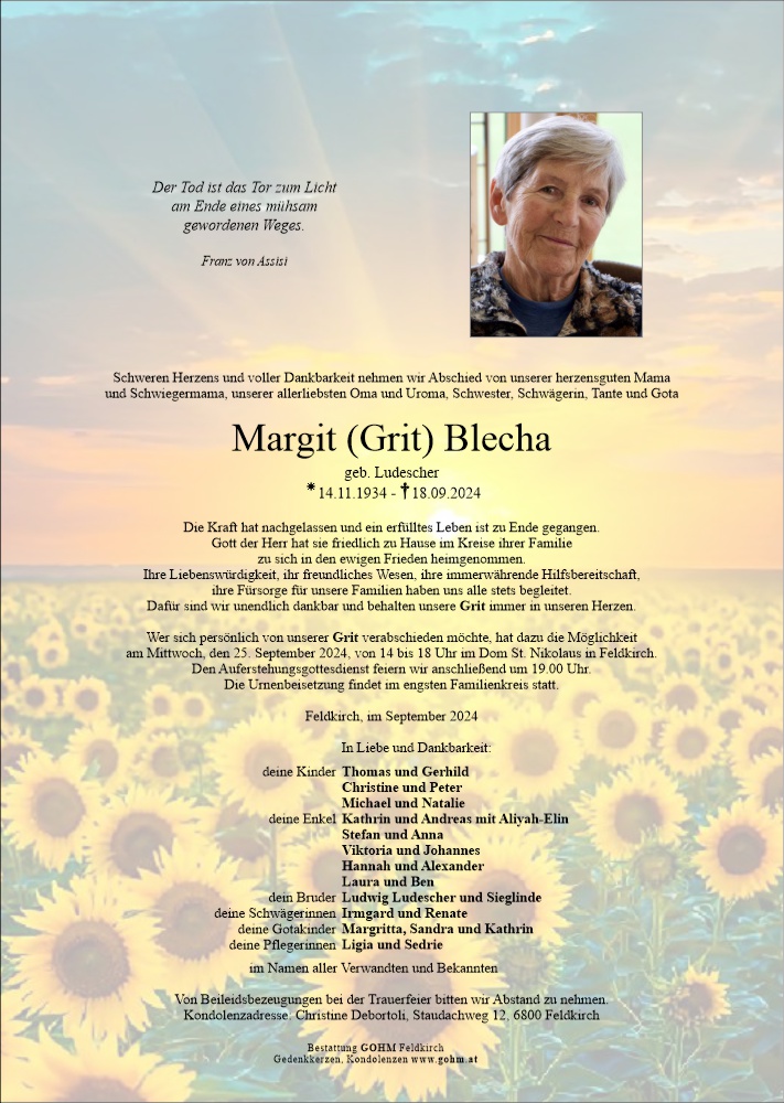 Bestattung wurde durchgeführt von: Martin Gohm Martin Gohm Bestattung Gohm Schregenbergstraße 5 6800 - Feldkirch Tel.: 05522 76071 zum Bestatter