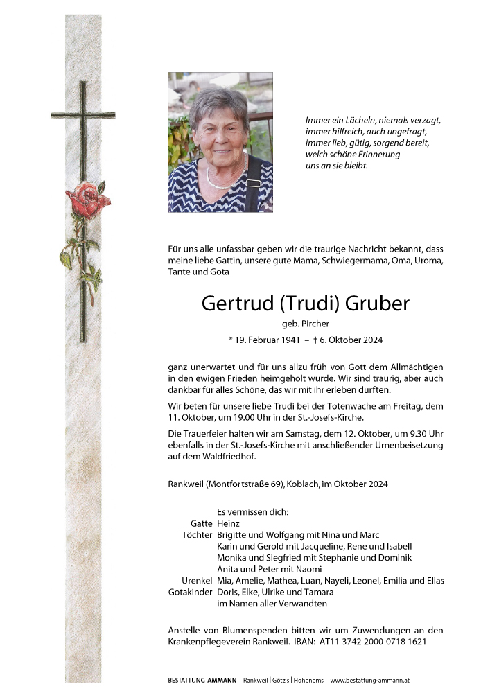 Bestattung wurde durchgeführt von: Bestattung Ammann Rankweil Ammann Bestattung GmbH Rankweil Splügenweg 1 6830 - Rankweil Tel.: 05522 42104 zum Bestatter