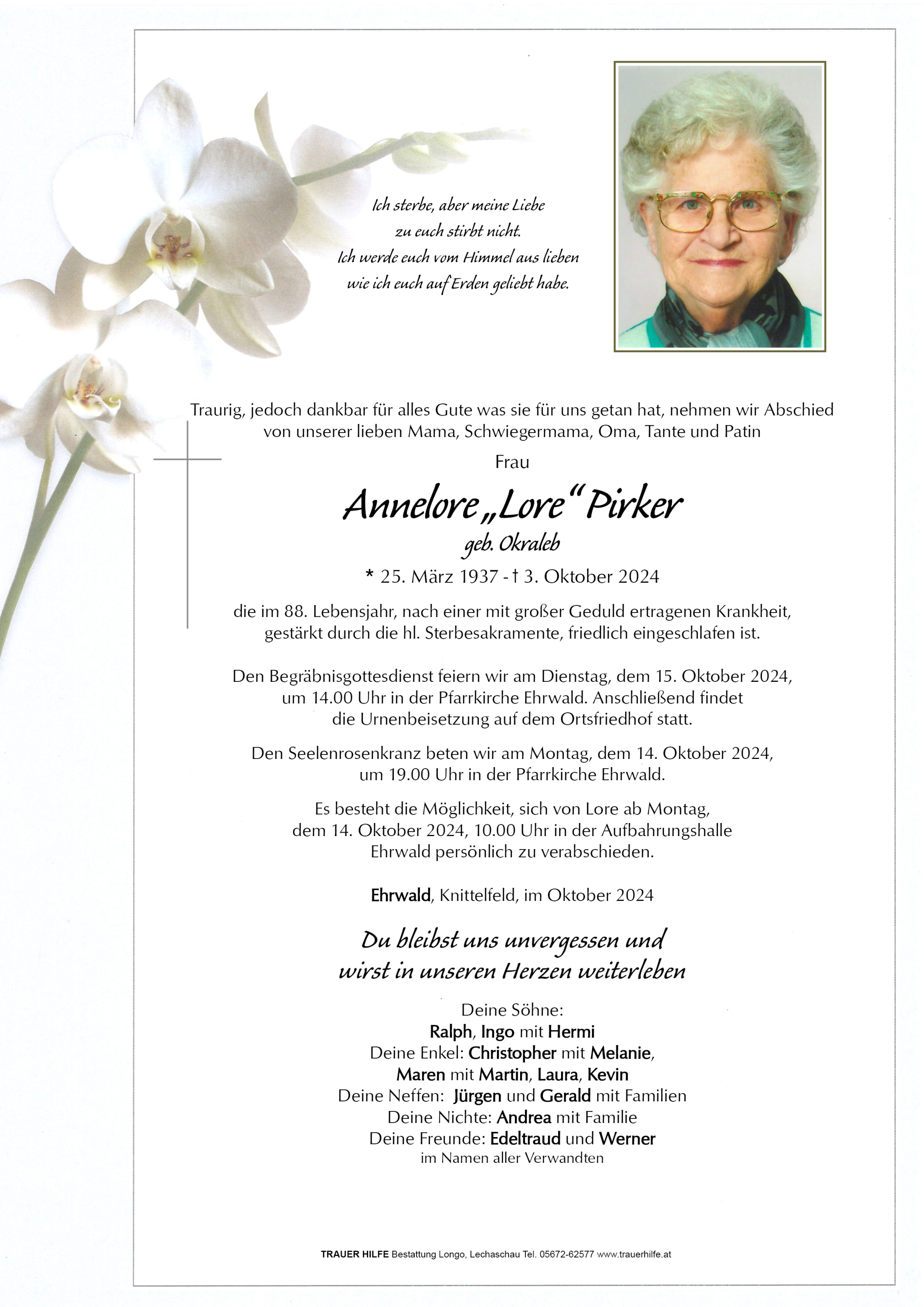 Liebe Lore. Danke dass ich dich kennenlernen durfte du hast mir immer ein lächeln ins Gesicht gezaubert und das machst du immer wenn ich an die Zeit mit dir denke. Machs guat!
