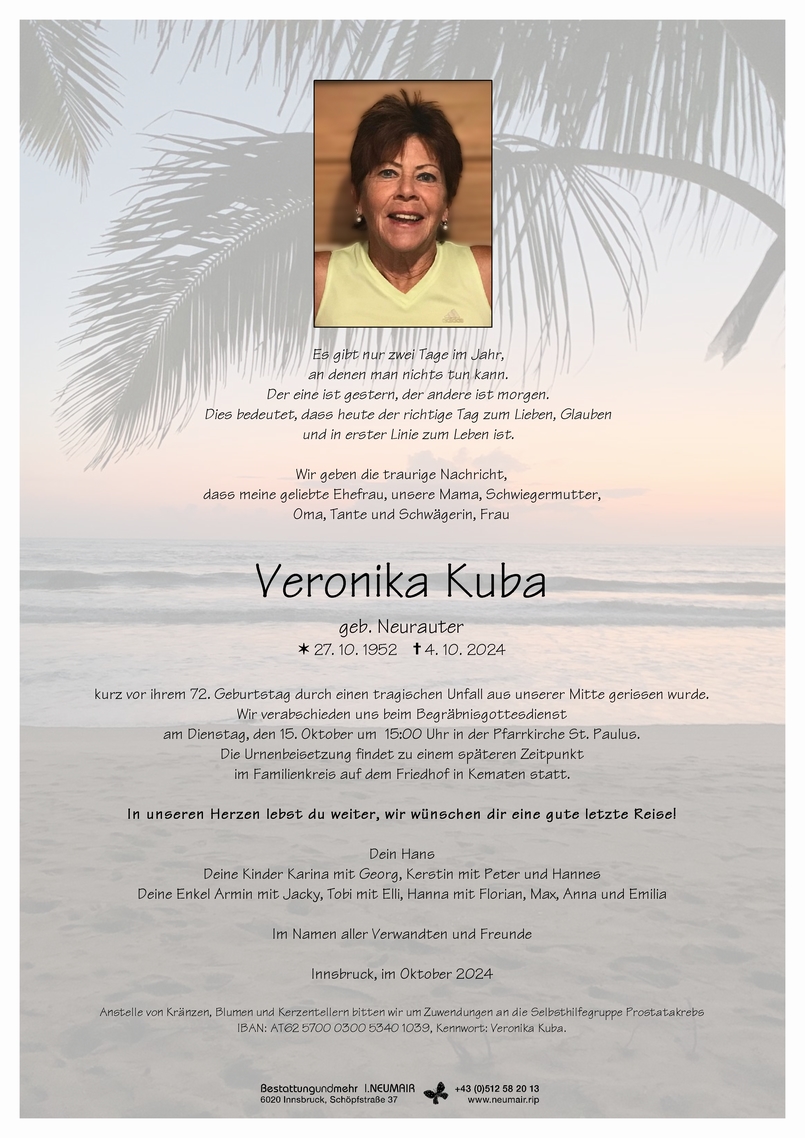 Bestattung wurde durchgeführt von: Dr. Christine Pernlochner - Bestattung und mehr I.Neumair Bestattung und mehr I. Neumair GmbH Schöpfstraße 37a 6020 - Innsbruck Tel.: 0512 582013 zum Bestatter