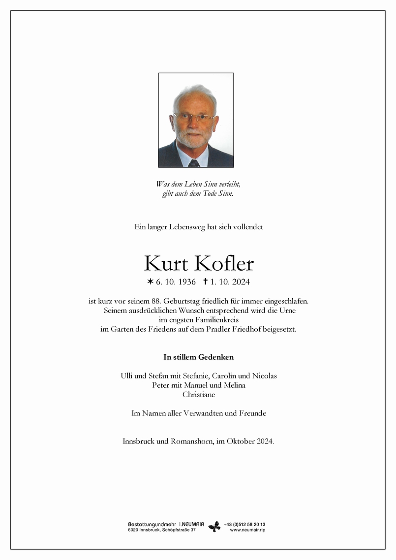Bestattung wurde durchgeführt von: Dr. Christine Pernlochner - Bestattung und mehr I.Neumair Bestattung und mehr I. Neumair GmbH Schöpfstraße 37a 6020 - Innsbruck Tel.: 0512 582013 zum Bestatter