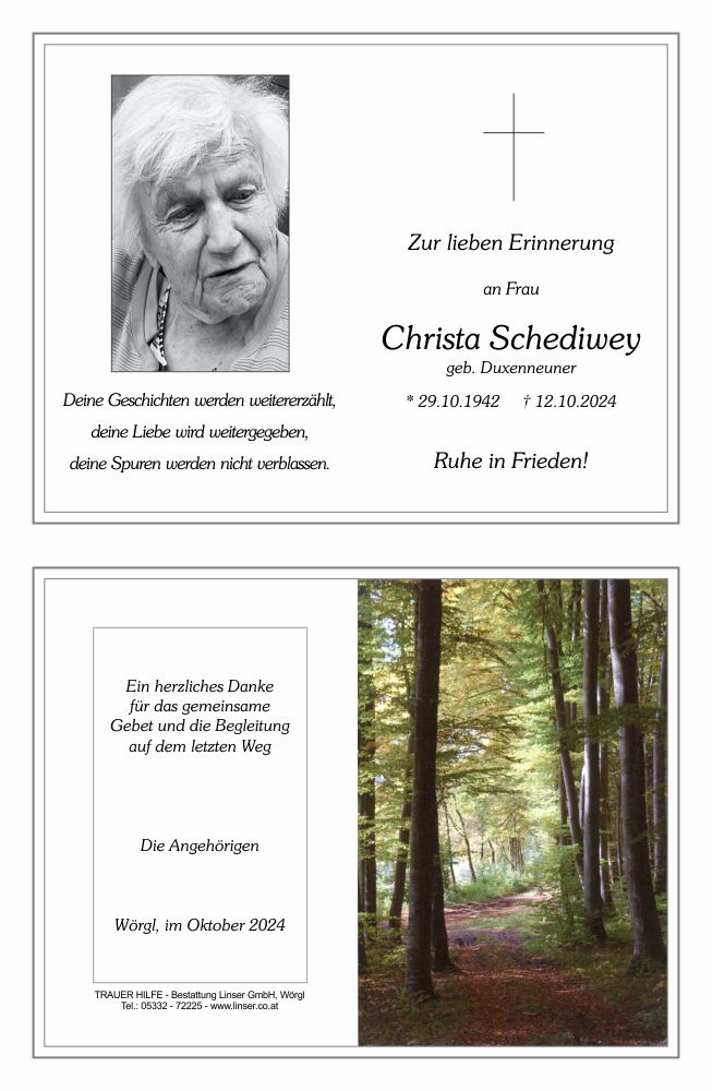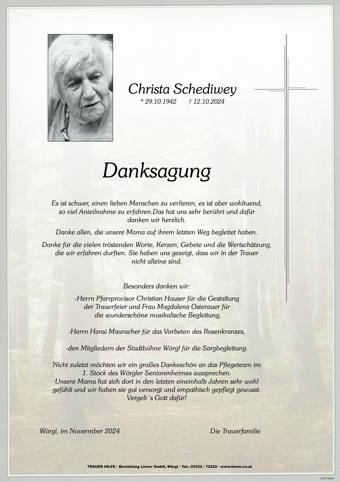 • Liebe Martina, liebe Trauernde, zufällig habe ich die Parte gesehen und eure Mama doch gleich erkannt. Ihre freundliche Art und netten Begegnungen beim Schwimmclub Wörgl lassen mich gerne erinnern. Herzliche Anteilnahme und viele gute Gedanken von der Dani (damals Winkler) aus Kundl