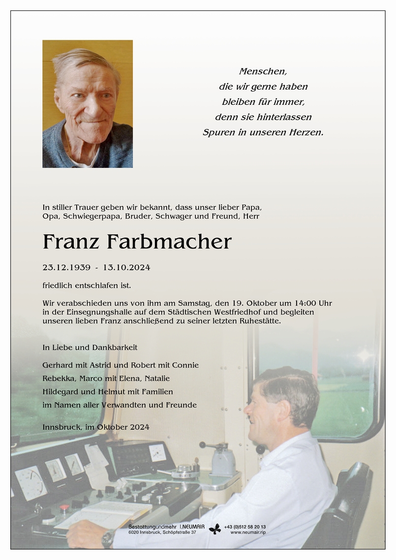 Bestattung wurde durchgeführt von: Dr. Christine Pernlochner - Bestattung und mehr I.Neumair Bestattung und mehr I. Neumair GmbH Schöpfstraße 37a 6020 - Innsbruck Tel.: 0512 582013 zum Bestatter