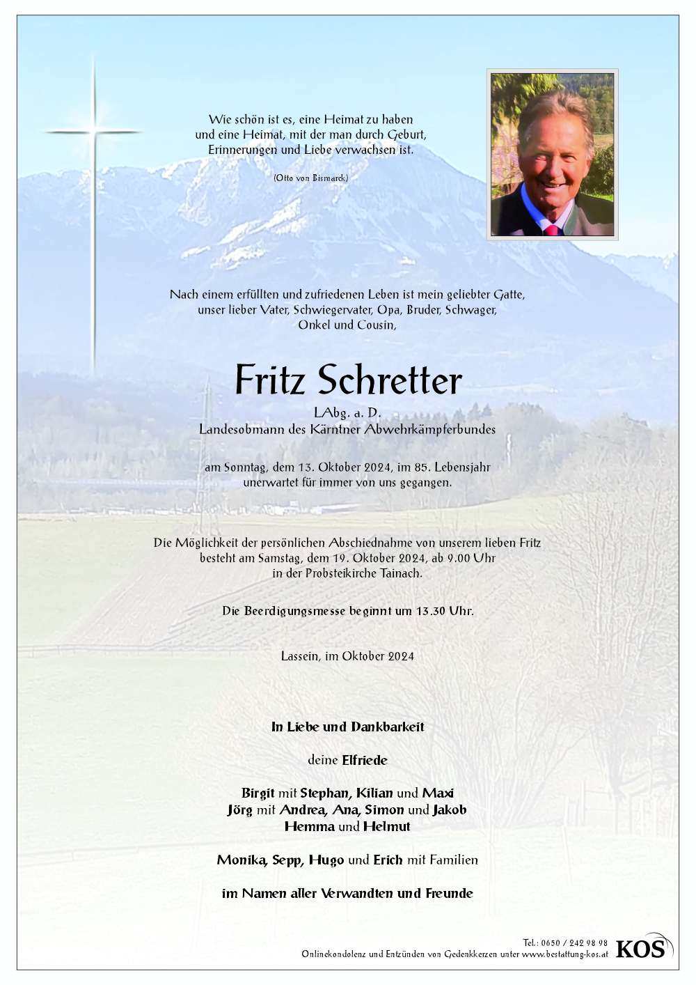 Liebe Trauerfamilie, lieber Fritz, als Obmann der Ortsgruppe Wien darf ich mich für Deine Freundschaft bedanken und möchte Dir mit der Zusicherung den ewigen Frieden wünschen, Dein Erbe so fortzusetzen, wie Du es als unser Landesobmann über so viele Jahre hinweg in Treue und Liebe zu unserer gemeinsamen Kärntner Heimat getan hast. Dein Wirken bleibt uns ein Vorbild. Der Familie wünsche ich viel Kraft in dieser schweren Stunde. Peter und Renate Wassertheurer, Wien.