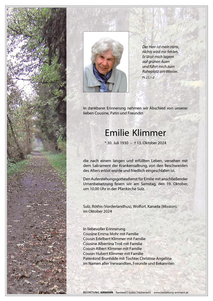 Bestattung wurde durchgeführt von: Bestattung Ammann Rankweil Ammann Bestattung GmbH Rankweil Splügenweg 1 6830 - Rankweil Tel.: 05522 42104 zum Bestatter