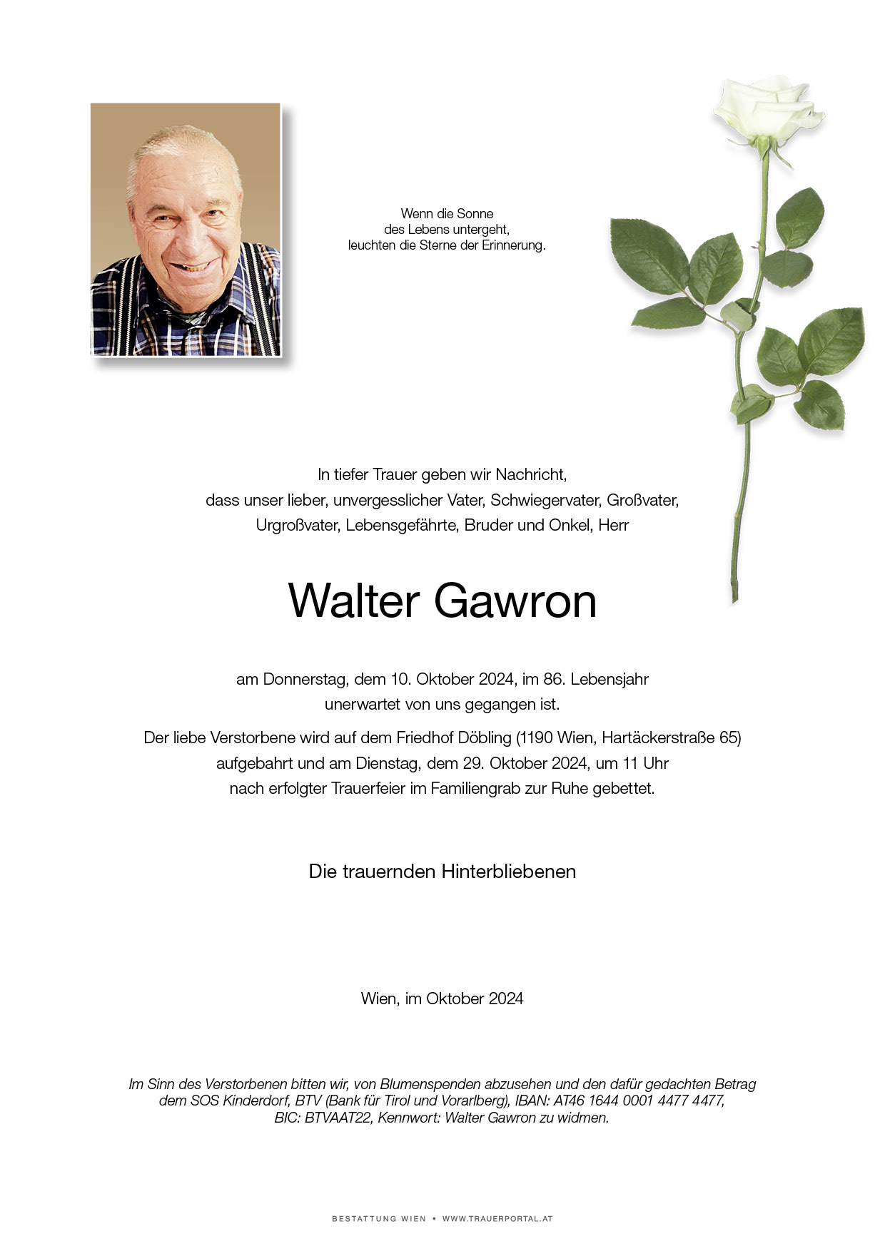 Bestattung wurde durchgeführt von: Bestattung Wien Bestattung Wien GmbH Simmeringer Hauptstraße 339 1110 - Wien (Simmering) Tel.: 01 501950 zum Bestatter