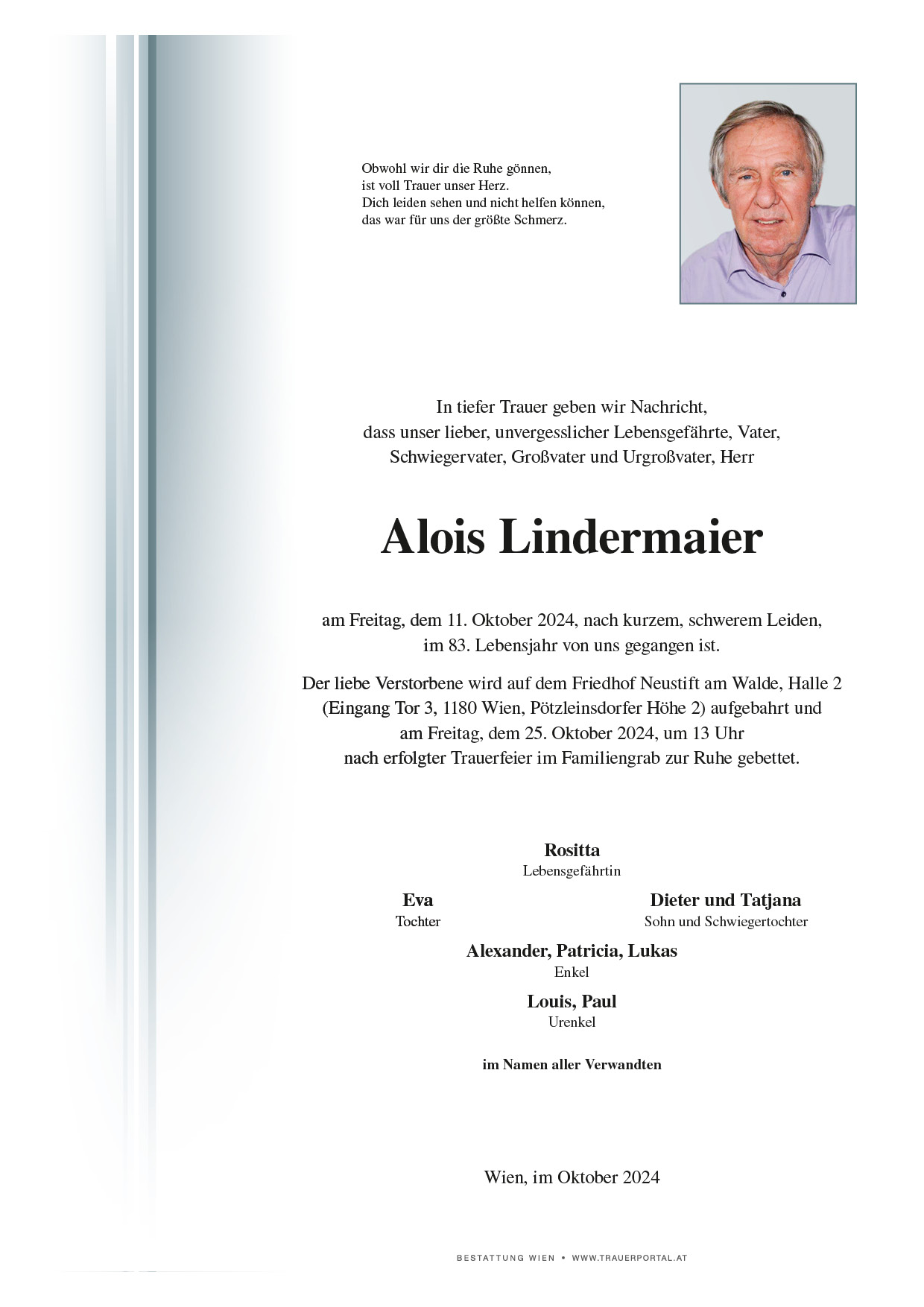 Bestattung wurde durchgeführt von: Bestattung Wien Bestattung Wien GmbH Simmeringer Hauptstraße 339 1110 - Wien (Simmering) Tel.: 01 501950 zum Bestatter