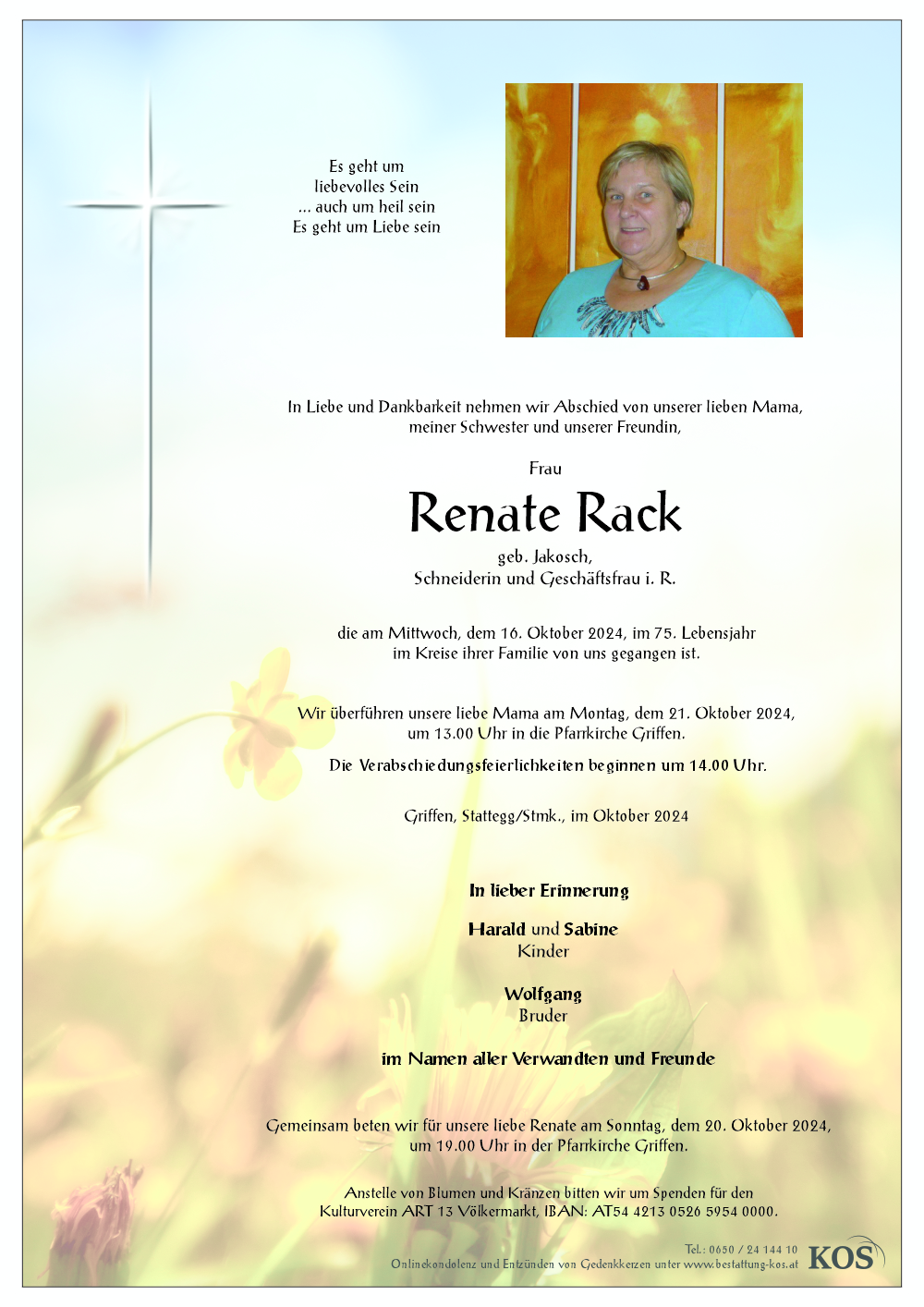 Bestattung wurde durchgeführt von: Familienbetrieb Bestattung Kos Bestattung A. & J. Kos GmbH Krankenhausstraße 2A 9400 - Wolfsberg Tel.: 0650 242 98 98 zum Bestatter
