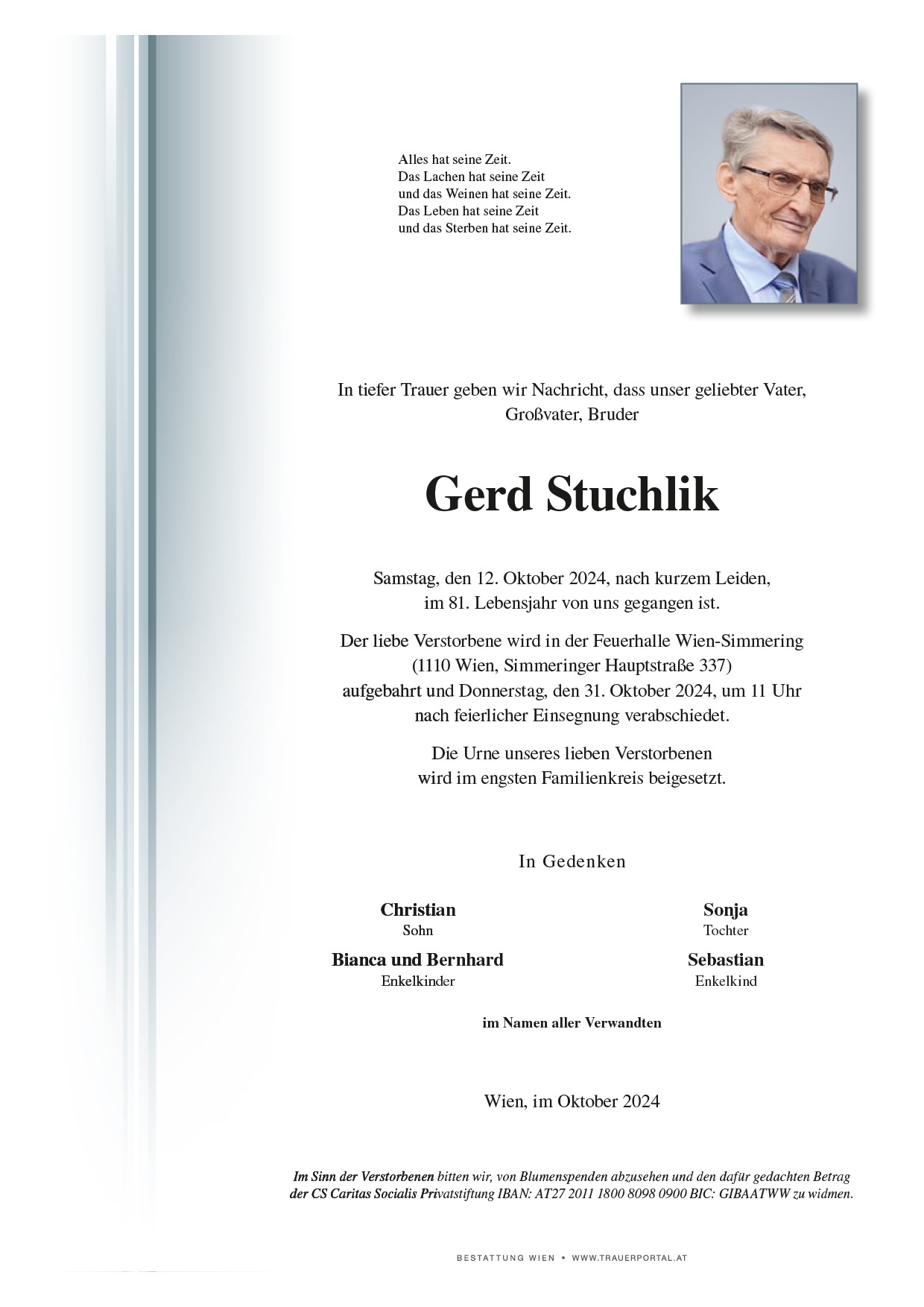 Bestattung wurde durchgeführt von: Bestattung Wien Bestattung Wien GmbH Simmeringer Hauptstraße 339 1110 - Wien (Simmering) Tel.: 01 501950 zum Bestatter
