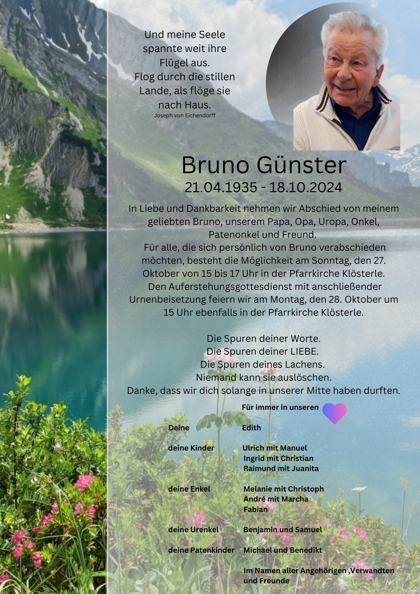 hiermit möchten wir unser tief empfundenes Beileid zum Verlust von Bruno ausdrücken. Der Tod eines geliebten Menschen ist unendlich schmerzhaft, besonders wenn er als Bruder von Irene und als unser Onkel auch in unserem Leben eine bedeutende Rolle gespielt hat. Mögen die Erinnerungen an seine Herzlichkeit, seinen unstillbaren Humor und die gemeinsamen Erlebnisse dir liebe Edith und euch und euren Familien in dieser schweren Zeit Trost spenden. In Gedanken wollen bei euch sein und nehmen Anteil an eurer Trauer. Wir wünschen euch von Herzen viel Kraft.