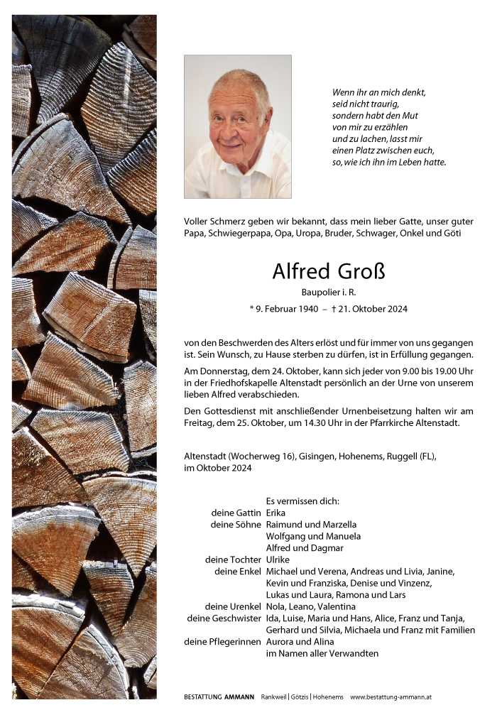 Bestattung wurde durchgeführt von: Bestattung Ammann Rankweil Ammann Bestattung GmbH Rankweil Splügenweg 1 6830 - Rankweil Tel.: 05522 42104 zum Bestatter