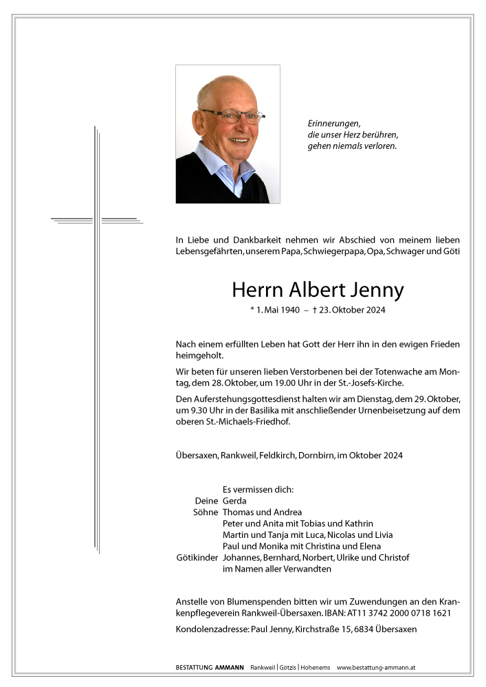 Bestattung wurde durchgeführt von: Bestattung Ammann Rankweil Ammann Bestattung GmbH Rankweil Splügenweg 1 6830 - Rankweil Tel.: 05522 42104 zum Bestatter
