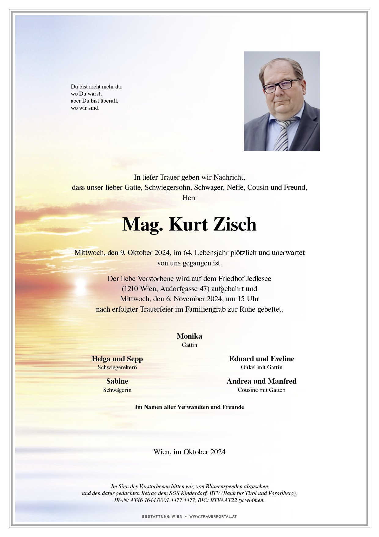 Bestattung wurde durchgeführt von: Bestattung Wien Bestattung Wien GmbH Simmeringer Hauptstraße 339 1110 - Wien (Simmering) Tel.: 01 501950 zum Bestatter