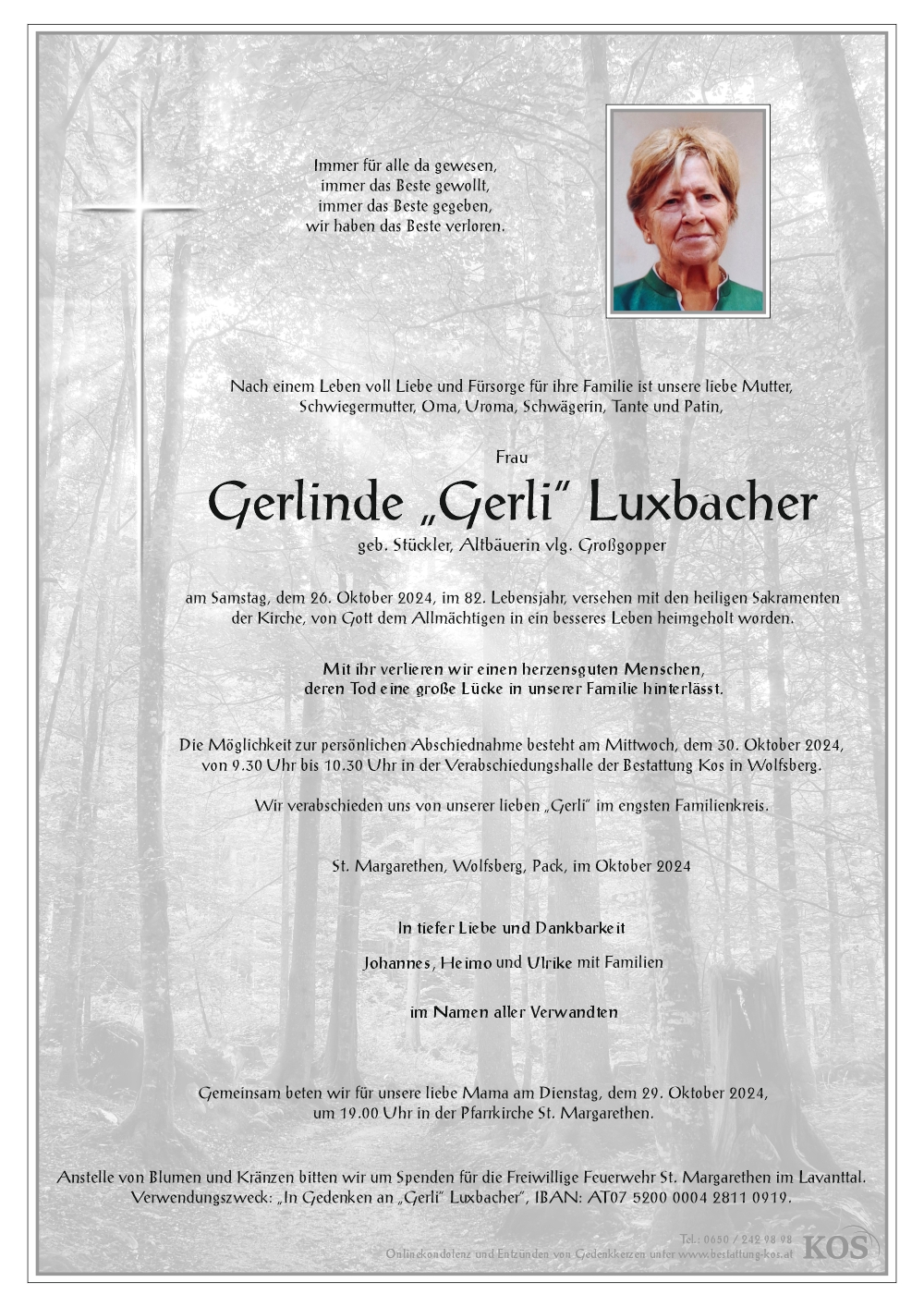 • Als Gott sah, dass der Weg zu lang, der Hügel zu steil, der Atem zu schwer wurde, legte er seinen Arm um dich und sprach: Komm heim! Mit Traurigkeit im Herzen verabschieden wir uns, liebe Gerli! Du warst ein so wunderbarer Mensch und alle fühlten sich wohl in deiner Nähe. Bei vielen Veranstaltungen, Ausflügen und Feiern warst du in unserer Mitte - für deine Herzlichkeit, dein Mitwirken und deine Gastfreundschaft möchten wir uns bei dir bedanken! Du wirst uns fehlen -in liebevollen Gedenken die Frauenrunde! Ruhe sanft liebe Gerli!