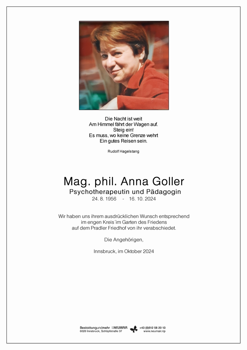 Bestattung wurde durchgeführt von: Dr. Christine Pernlochner - Bestattung und mehr I.Neumair Bestattung und mehr I. Neumair GmbH Schöpfstraße 37a 6020 - Innsbruck Tel.: 0512 582013 zum Bestatter