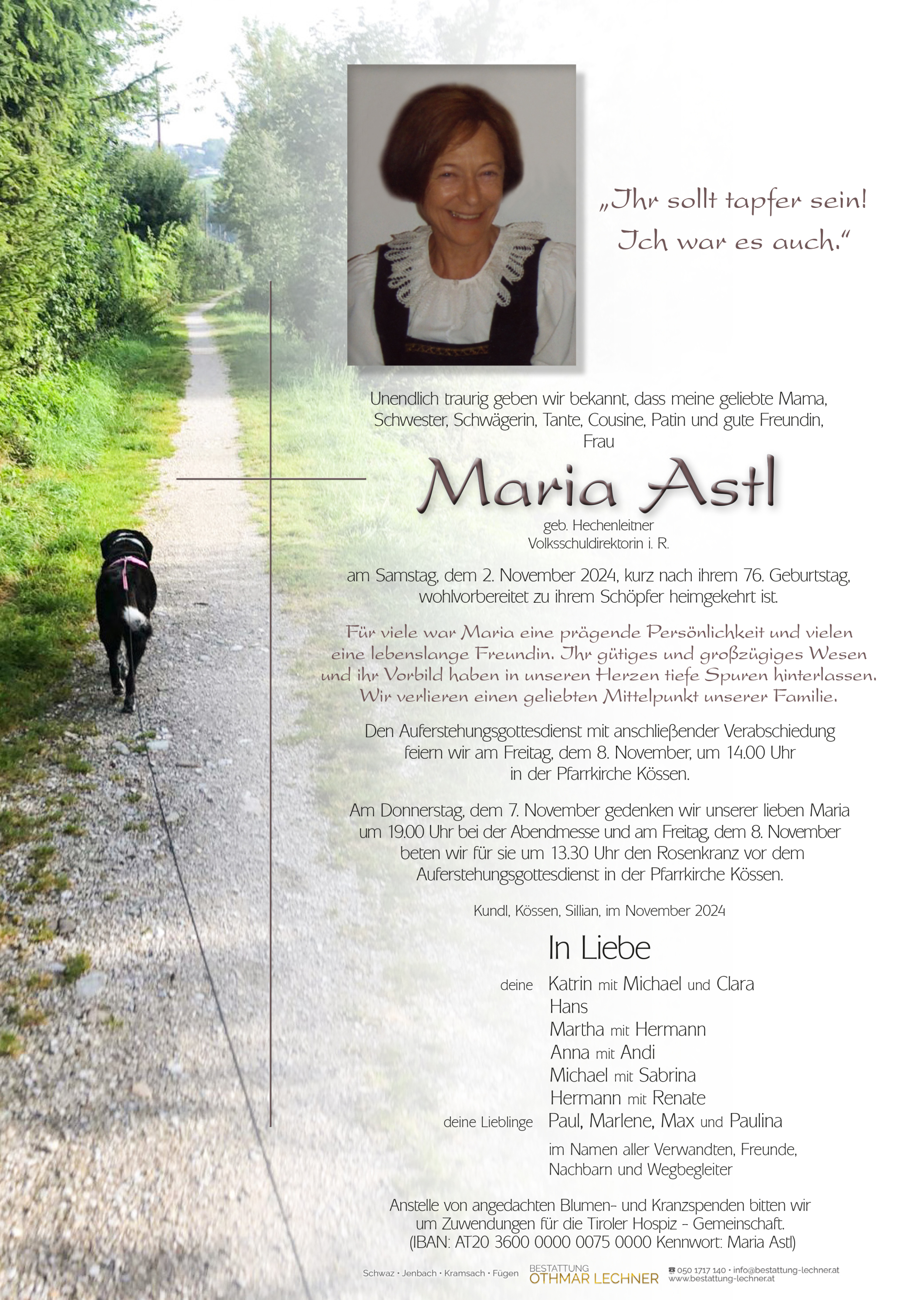 Es hat mich sehr traurig gemacht als ich vom Ableben deiner Mama erfahren musste. Ich habe Maria immer sehr geschätzt und freute mich, wenn ich sie zufällig auf einem ihrer Kössen-Besuche getroffen habe.