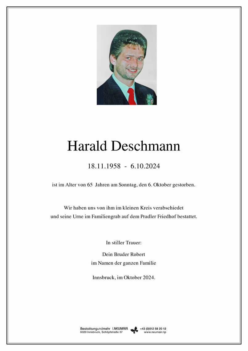 Bestattung wurde durchgeführt von: Dr. Christine Pernlochner - Bestattung und mehr I.Neumair Bestattung und mehr I. Neumair GmbH Schöpfstraße 37a 6020 - Innsbruck Tel.: 0512 582013 zum Bestatter