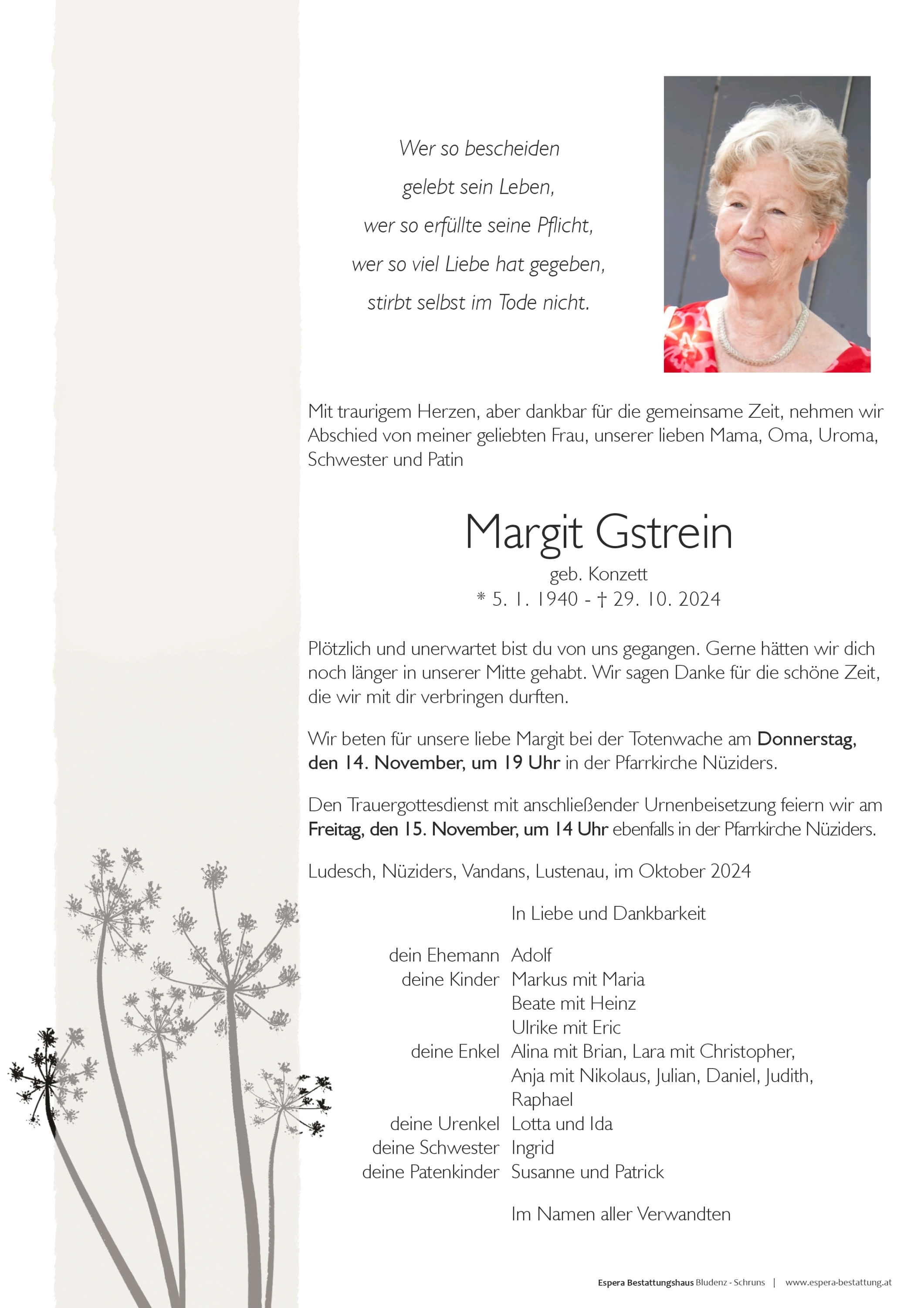 Aufrichtige Anteilnahme zum Heimgang, unserer lieben Margit , Kraft und Liebe für die ganze Familie ,Adolf einen liebevollen Drücker