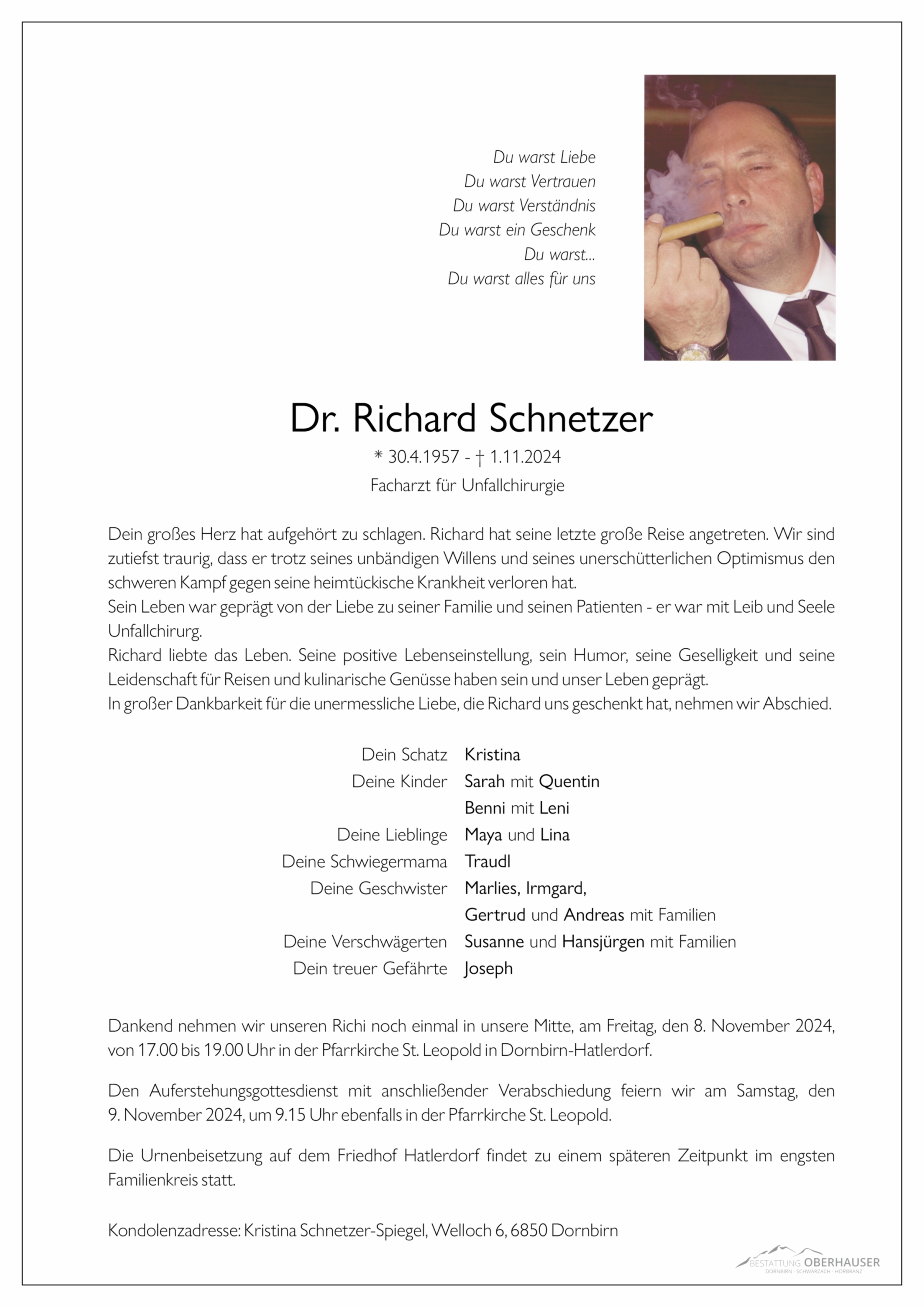 Bestattung wurde durchgeführt von: Carolin und Christoph Metzler Bestattung Oberhauser GesmbH Franz-Michael-Felder Straße 10 6850 - Dornbirn Tel.: 05572/20630 zum Bestatter