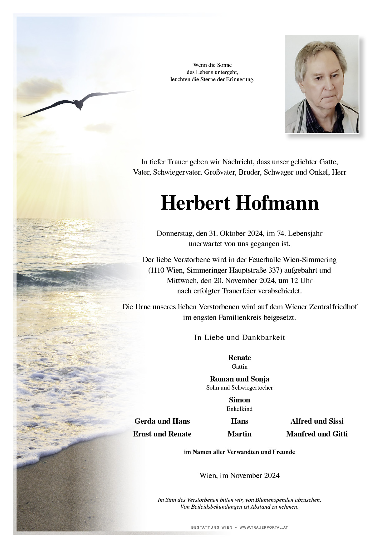 Bestattung wurde durchgeführt von: Bestattung Wien Bestattung Wien GmbH Simmeringer Hauptstraße 339 1110 - Wien (Simmering) Tel.: 01 501950 zum Bestatter
