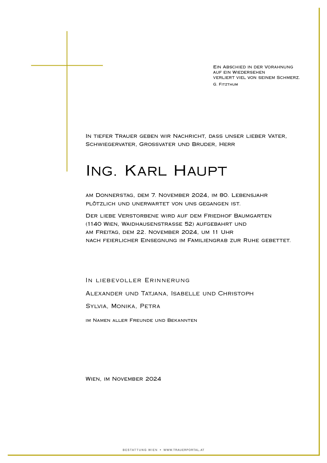 Bestattung wurde durchgeführt von: Bestattung Wien Bestattung Wien GmbH Simmeringer Hauptstraße 339 1110 - Wien (Simmering) Tel.: 01 501950 zum Bestatter