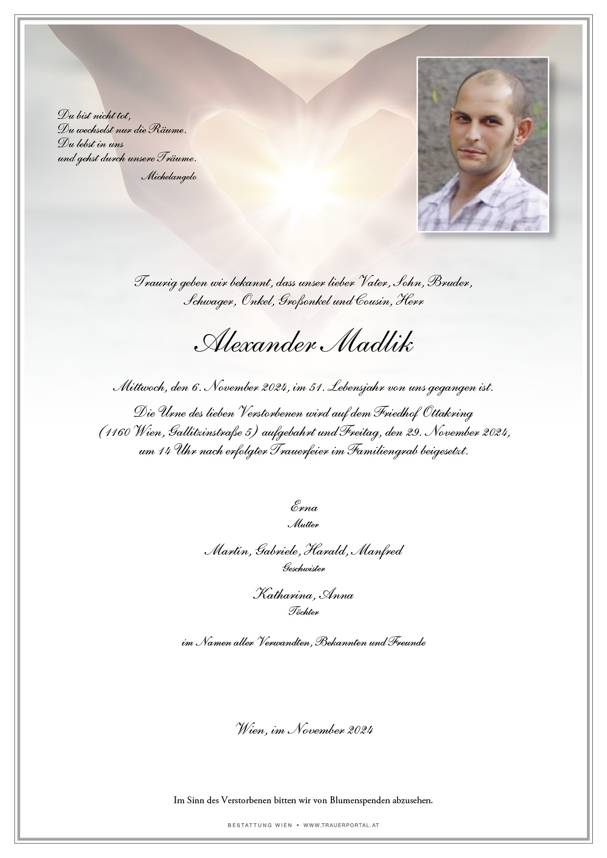 Bestattung wurde durchgeführt von: Bestattung Wien Bestattung Wien GmbH Simmeringer Hauptstraße 339 1110 - Wien (Simmering) Tel.: 01 501950 zum Bestatter