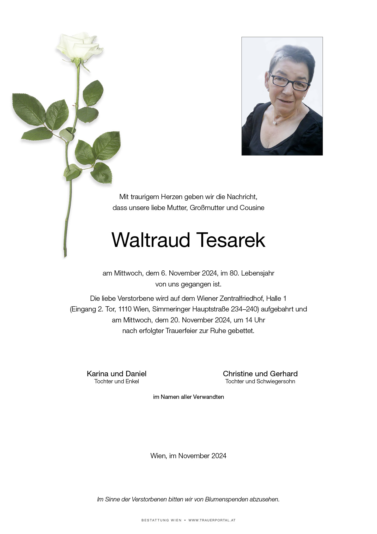 Bestattung wurde durchgeführt von: Bestattung Wien Bestattung Wien GmbH Simmeringer Hauptstraße 339 1110 - Wien (Simmering) Tel.: 01 501950 zum Bestatter
