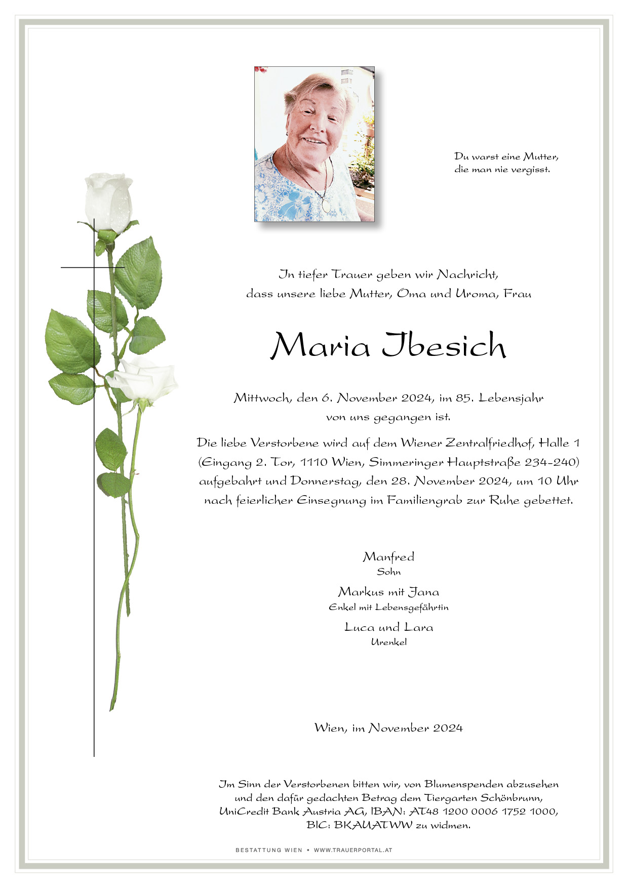 Bestattung wurde durchgeführt von: Bestattung Wien Bestattung Wien GmbH Simmeringer Hauptstraße 339 1110 - Wien (Simmering) Tel.: 01 501950 zum Bestatter