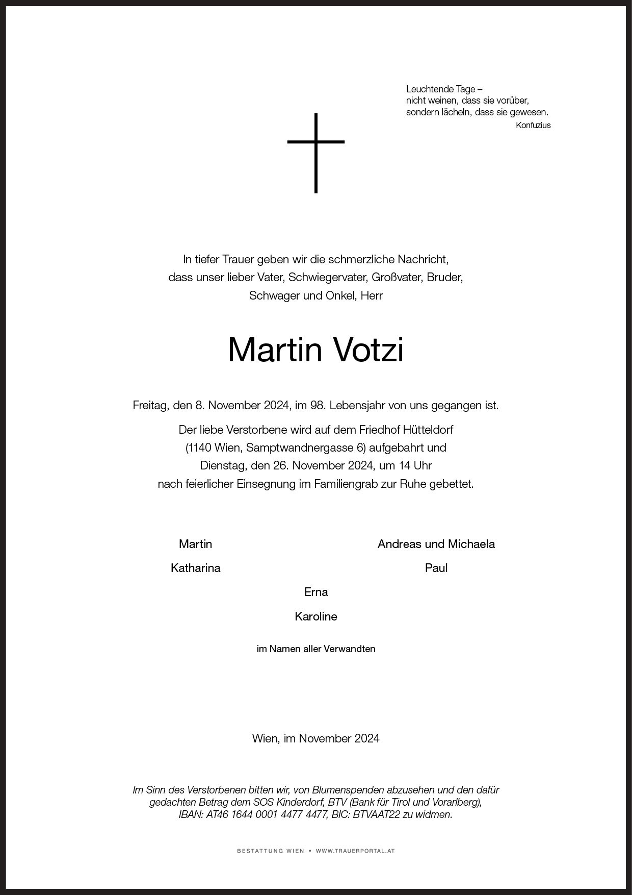 Bestattung wurde durchgeführt von: Bestattung Wien Bestattung Wien GmbH Simmeringer Hauptstraße 339 1110 - Wien (Simmering) Tel.: 01 501950 zum Bestatter
