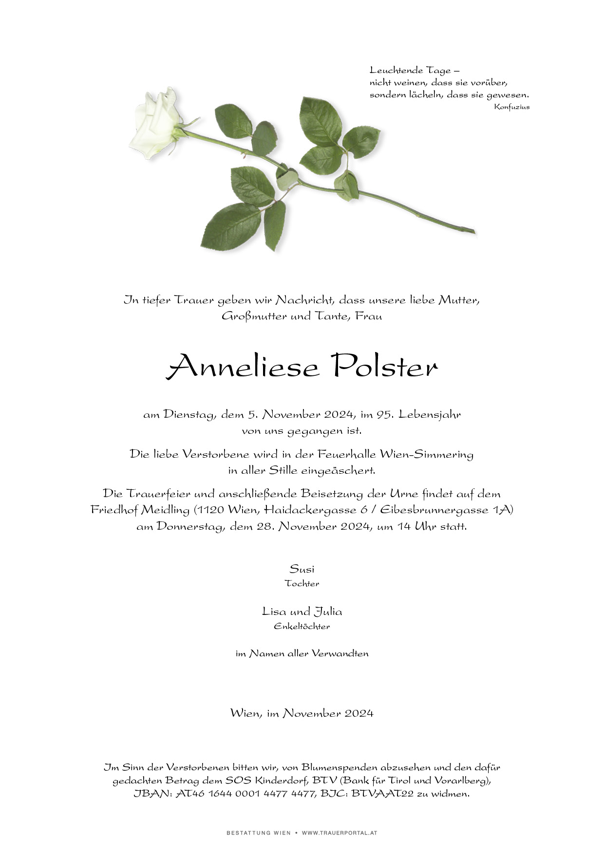 Bestattung wurde durchgeführt von: Bestattung Wien Bestattung Wien GmbH Simmeringer Hauptstraße 339 1110 - Wien (Simmering) Tel.: 01 501950 zum Bestatter