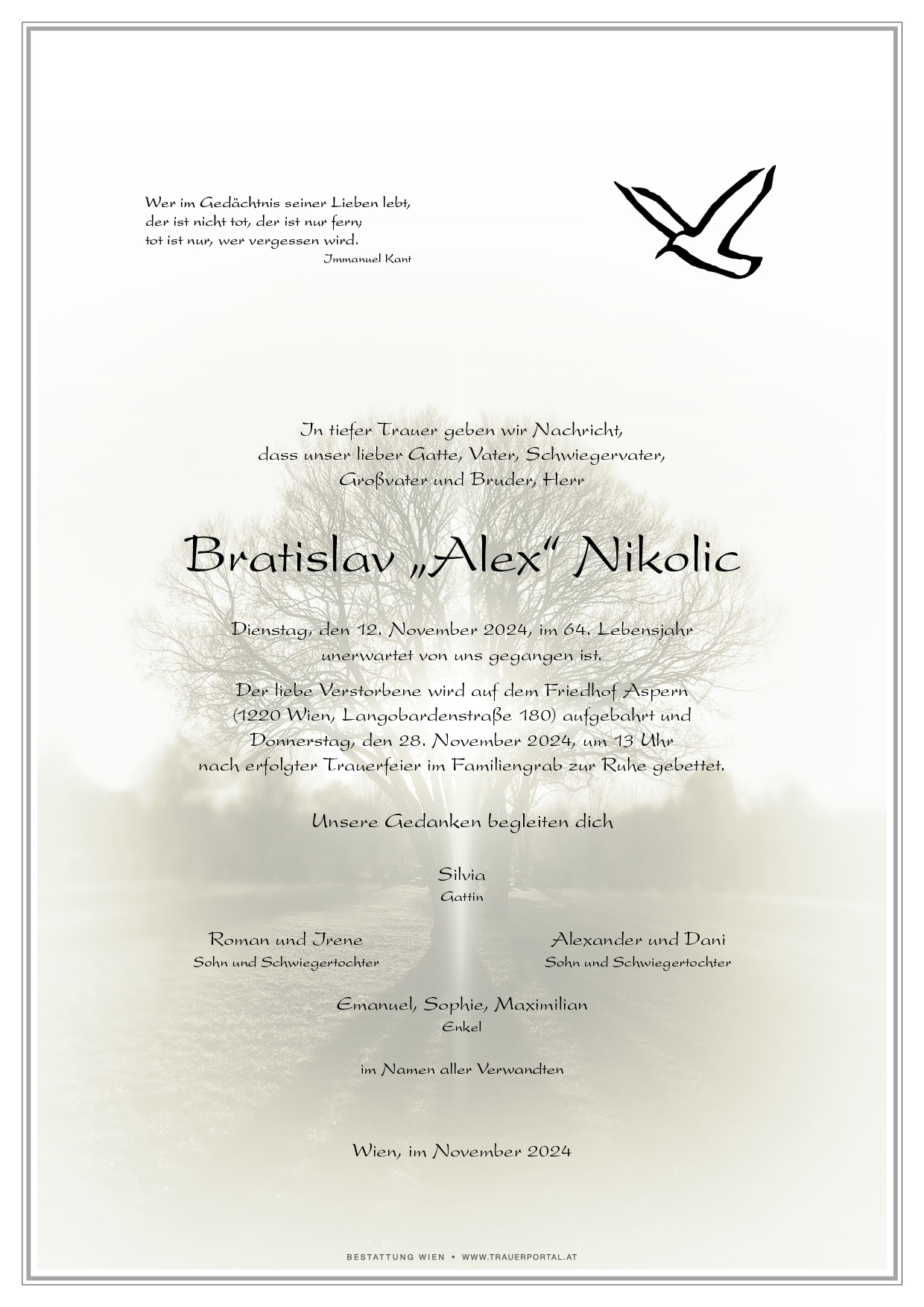 Bestattung wurde durchgeführt von: Bestattung Wien Bestattung Wien GmbH Simmeringer Hauptstraße 339 1110 - Wien (Simmering) Tel.: 01 501950 zum Bestatter
