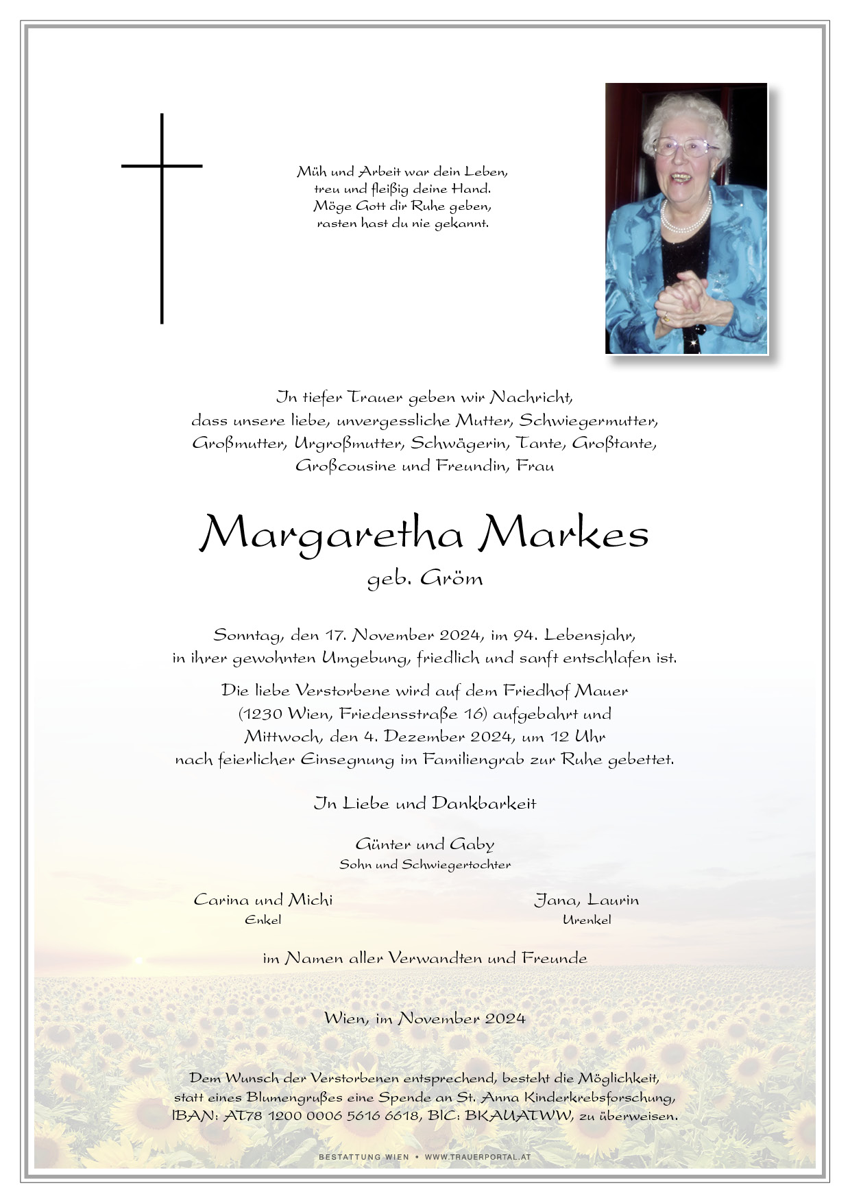 Bestattung wurde durchgeführt von: Bestattung Wien Bestattung Wien GmbH Simmeringer Hauptstraße 339 1110 - Wien (Simmering) Tel.: 01 501950 zum Bestatter