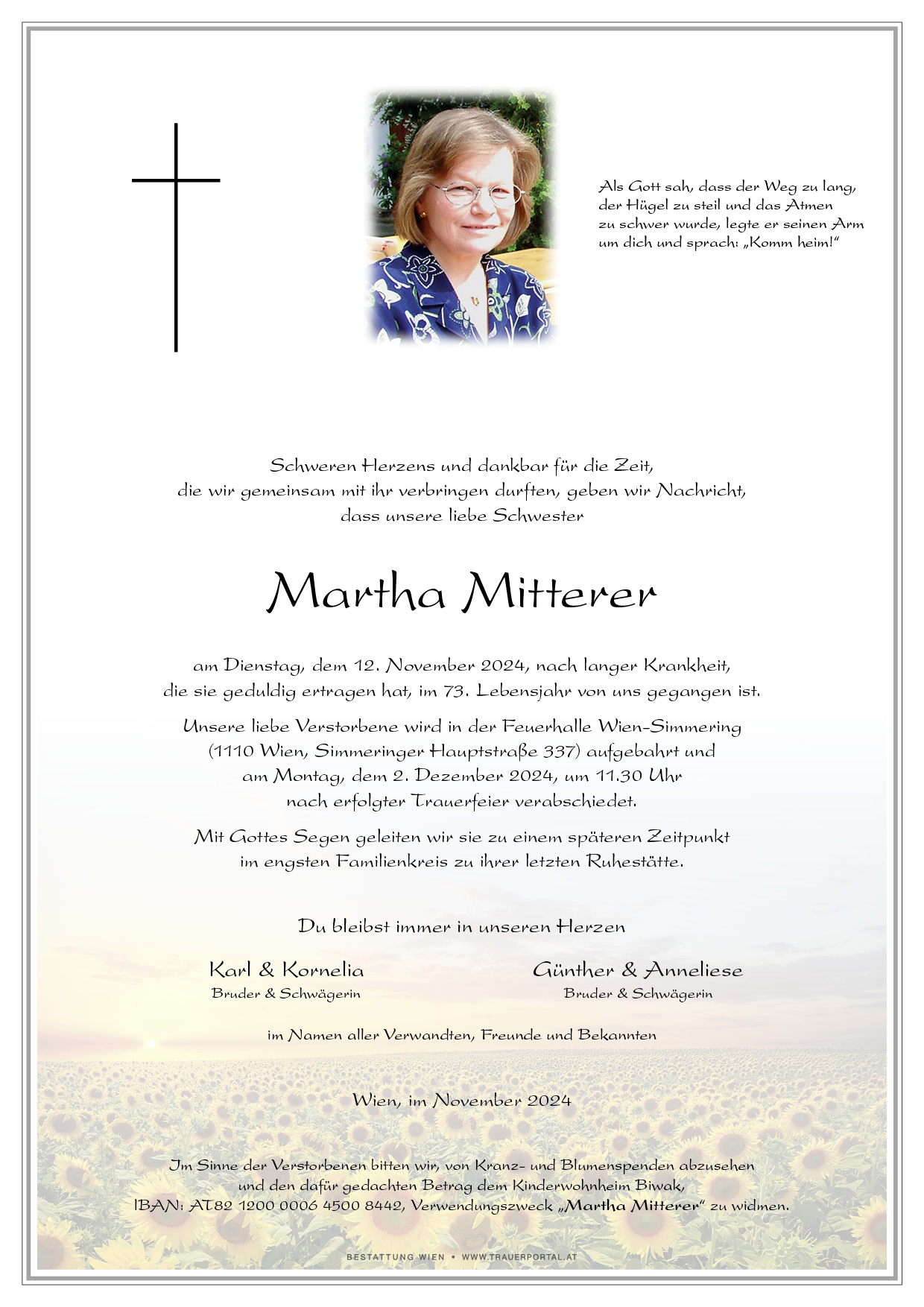Bestattung wurde durchgeführt von: Bestattung Wien Bestattung Wien GmbH Simmeringer Hauptstraße 339 1110 - Wien (Simmering) Tel.: 01 501950 zum Bestatter