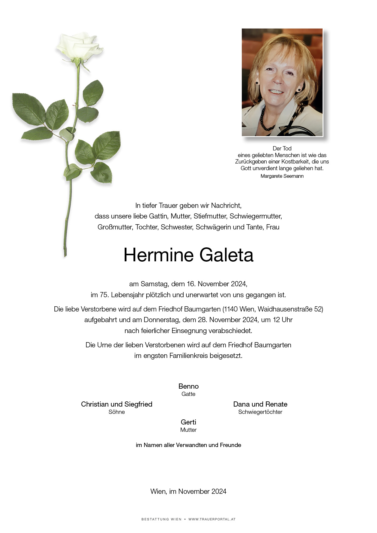 Bestattung wurde durchgeführt von: Bestattung Wien Bestattung Wien GmbH Simmeringer Hauptstraße 339 1110 - Wien (Simmering) Tel.: 01 501950 zum Bestatter