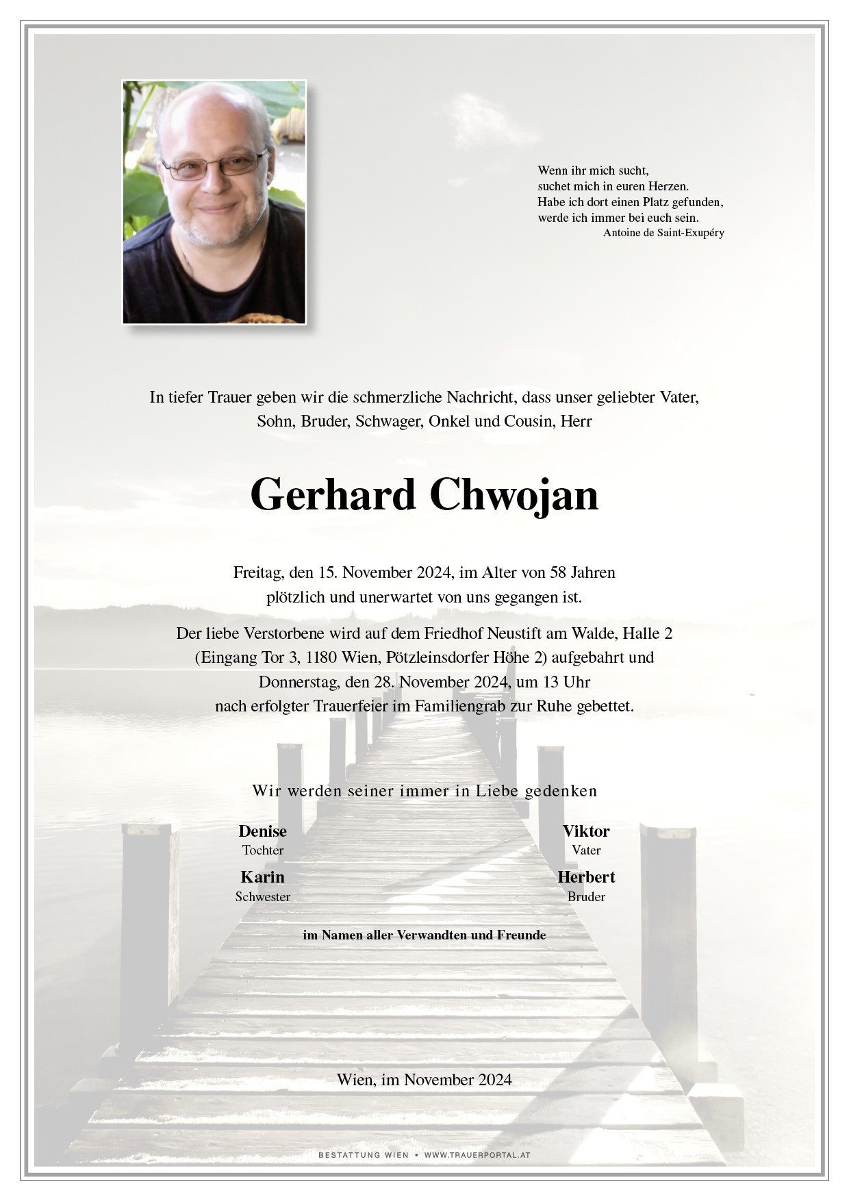 Bestattung wurde durchgeführt von: Bestattung Wien Bestattung Wien GmbH Simmeringer Hauptstraße 339 1110 - Wien (Simmering) Tel.: 01 501950 zum Bestatter