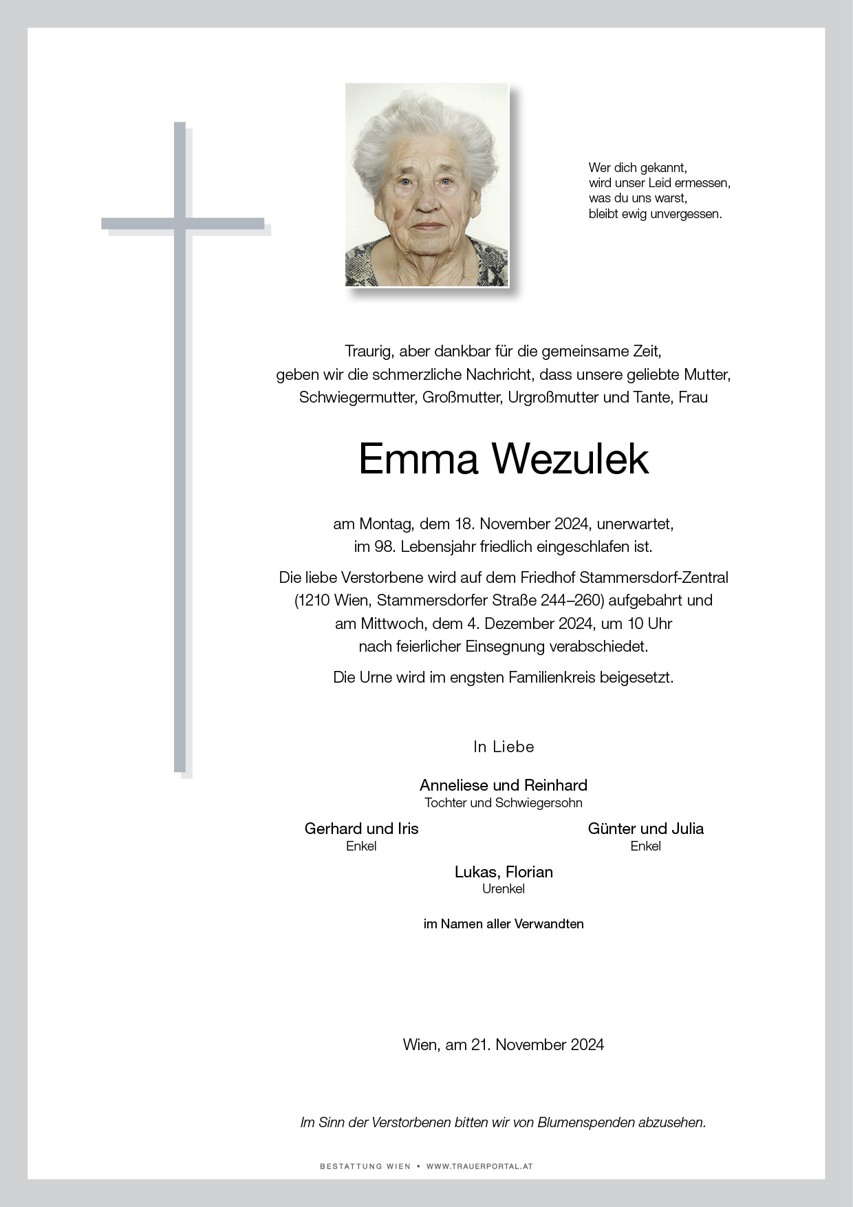 Bestattung wurde durchgeführt von: Bestattung Wien Bestattung Wien GmbH Simmeringer Hauptstraße 339 1110 - Wien (Simmering) Tel.: 01 501950 zum Bestatter