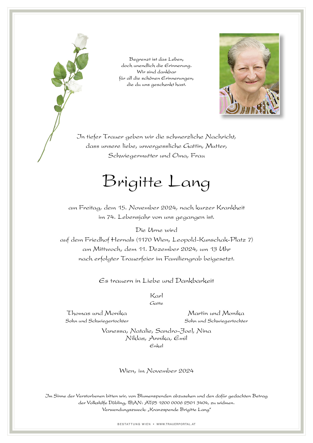 Bestattung wurde durchgeführt von: Bestattung Wien Bestattung Wien GmbH Simmeringer Hauptstraße 339 1110 - Wien (Simmering) Tel.: 01 501950 zum Bestatter