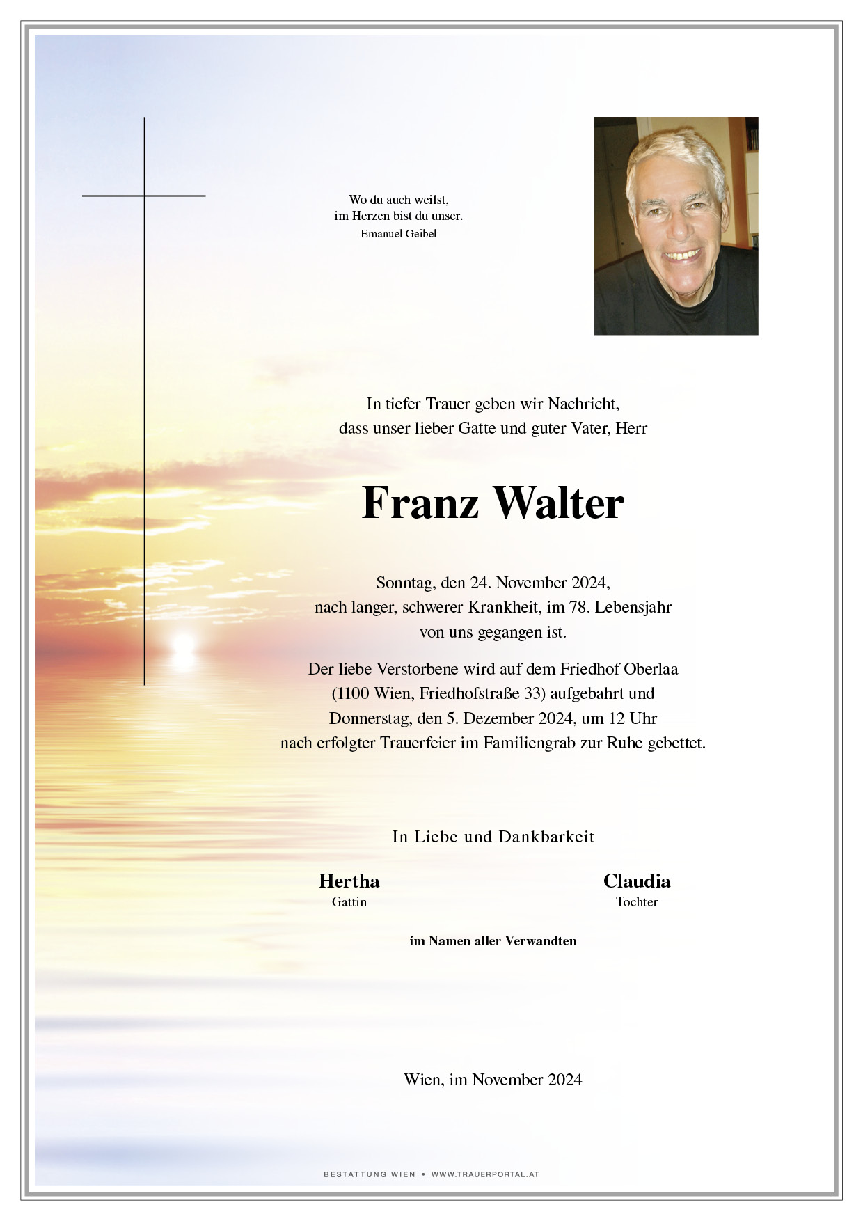 Bestattung wurde durchgeführt von: Bestattung Wien Bestattung Wien GmbH Simmeringer Hauptstraße 339 1110 - Wien (Simmering) Tel.: 01 501950 zum Bestatter