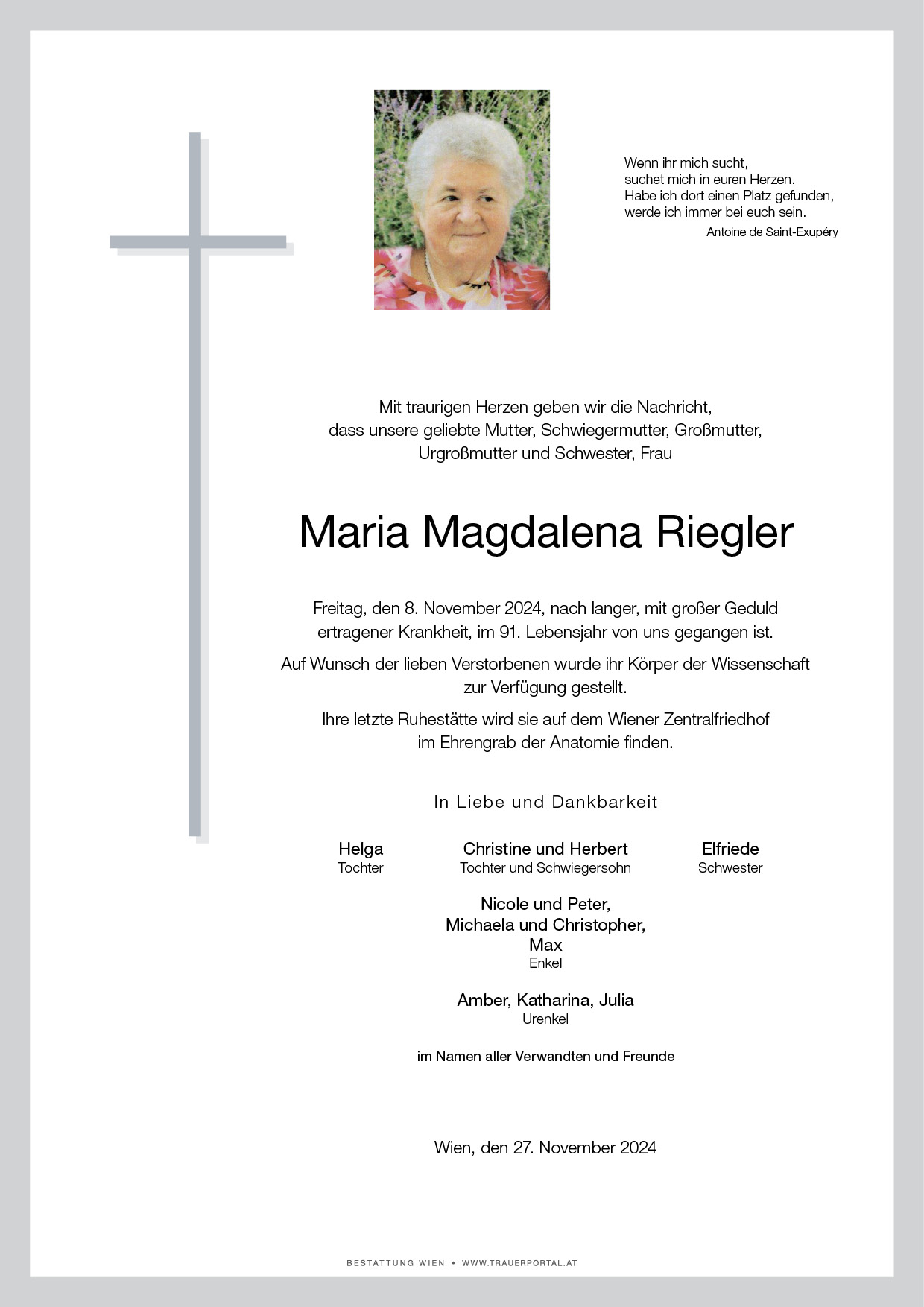 Neue Kerze für Maria Magdalena Riegler entzünden.