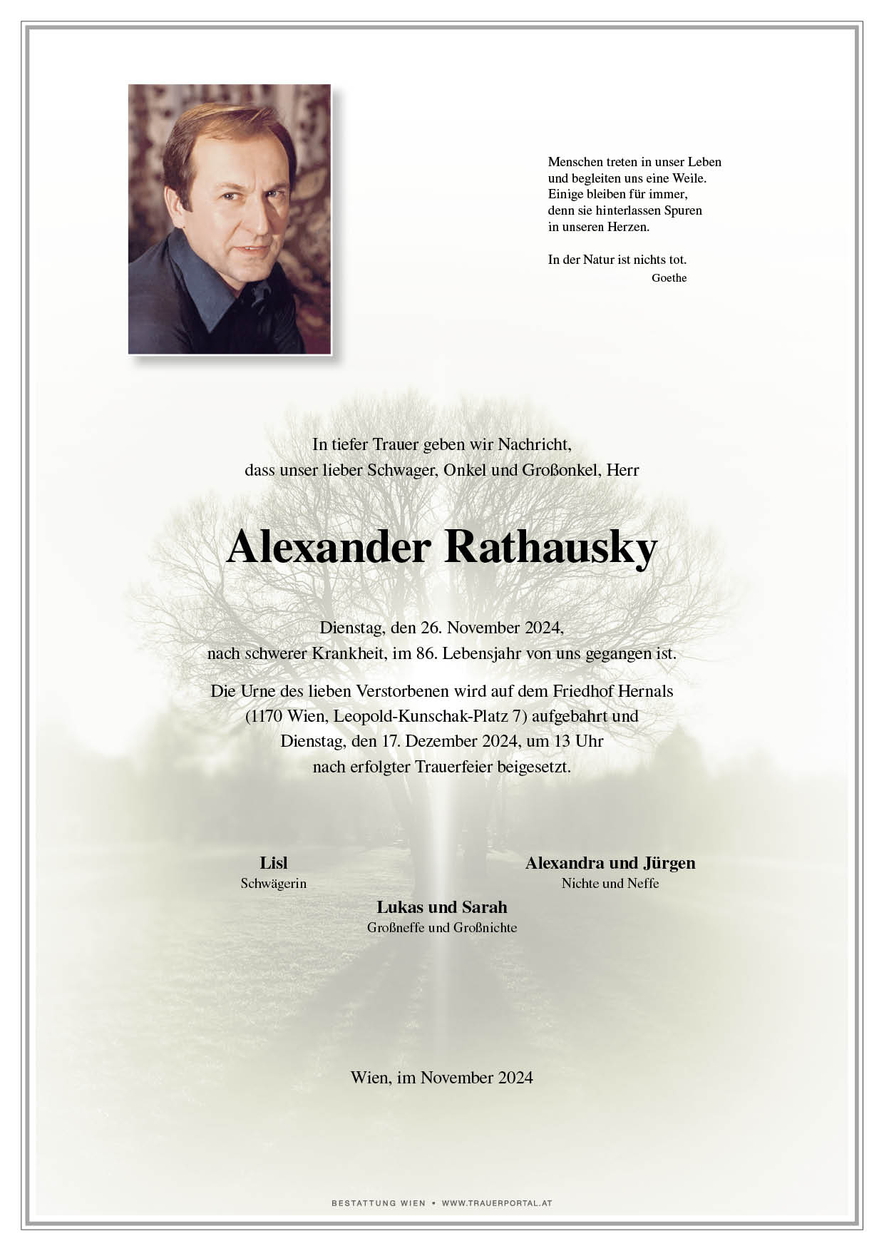 Bestattung wurde durchgeführt von: Bestattung Wien Bestattung Wien GmbH Simmeringer Hauptstraße 339 1110 - Wien (Simmering) Tel.: 01 501950 zum Bestatter
