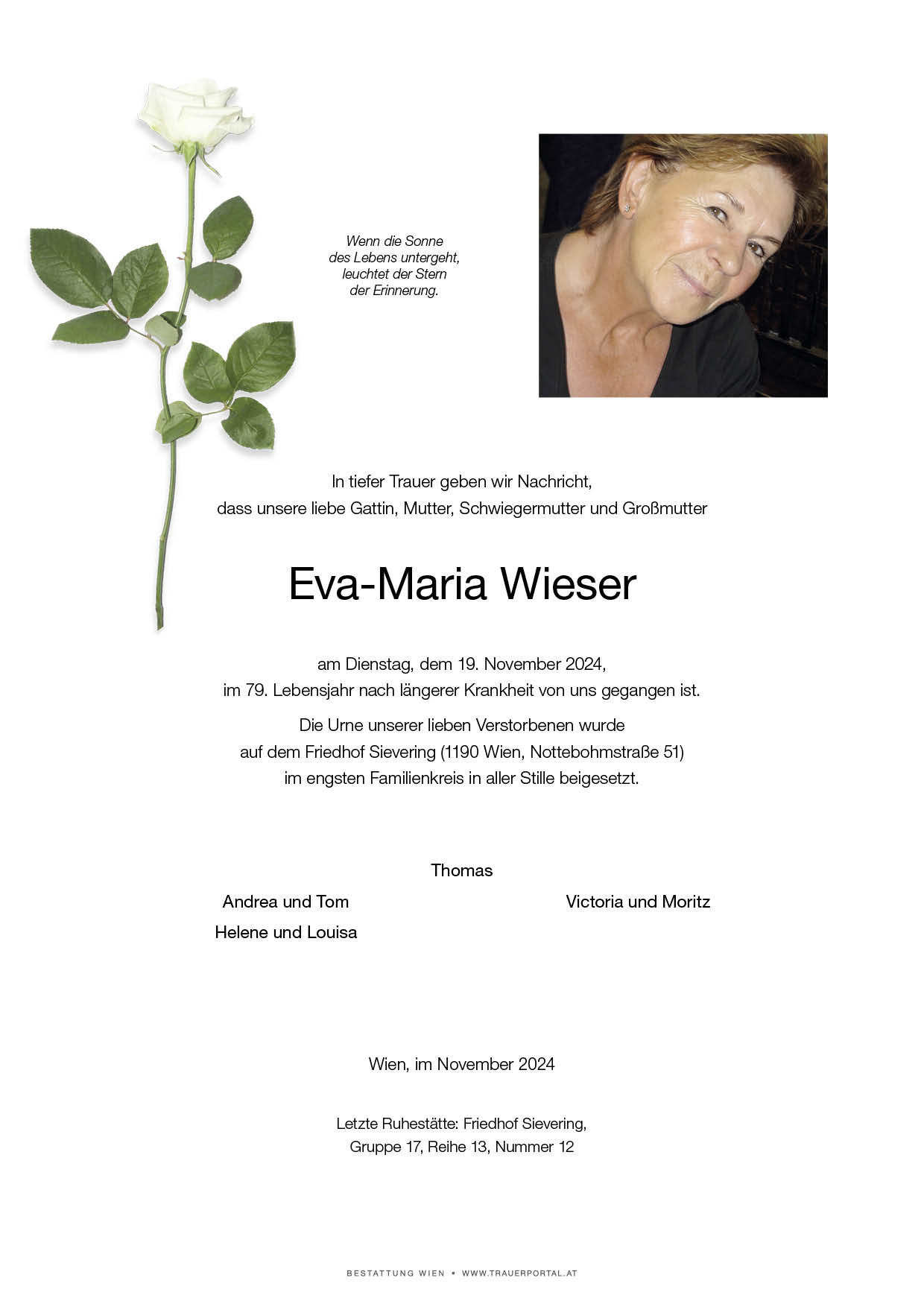 Bestattung wurde durchgeführt von: Bestattung Wien Bestattung Wien GmbH Simmeringer Hauptstraße 339 1110 - Wien (Simmering) Tel.: 01 501950 zum Bestatter