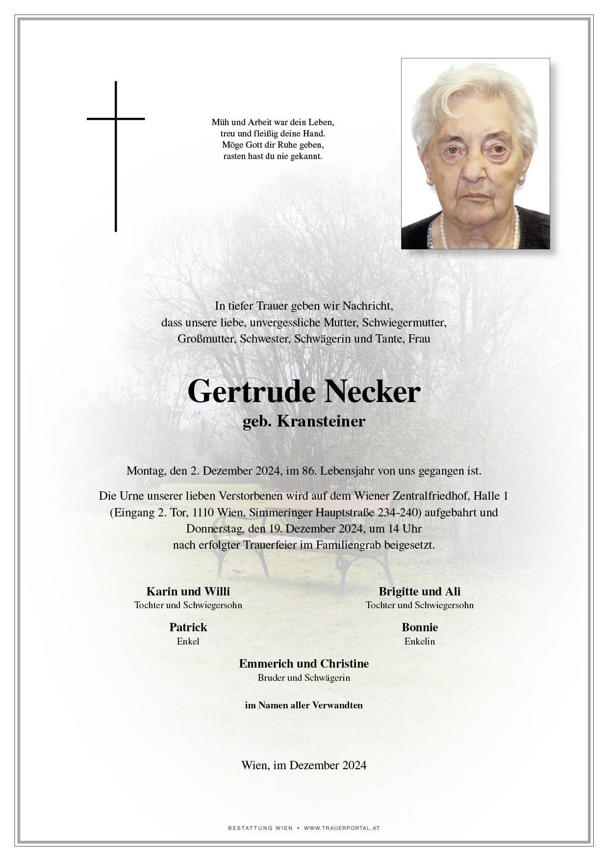 Bestattung wurde durchgeführt von: Bestattung Wien Bestattung Wien GmbH Simmeringer Hauptstraße 339 1110 - Wien (Simmering) Tel.: 01 501950 zum Bestatter