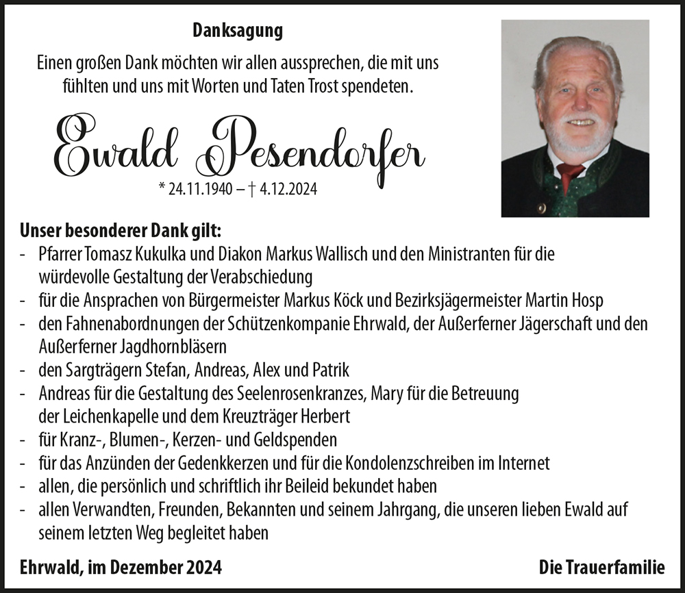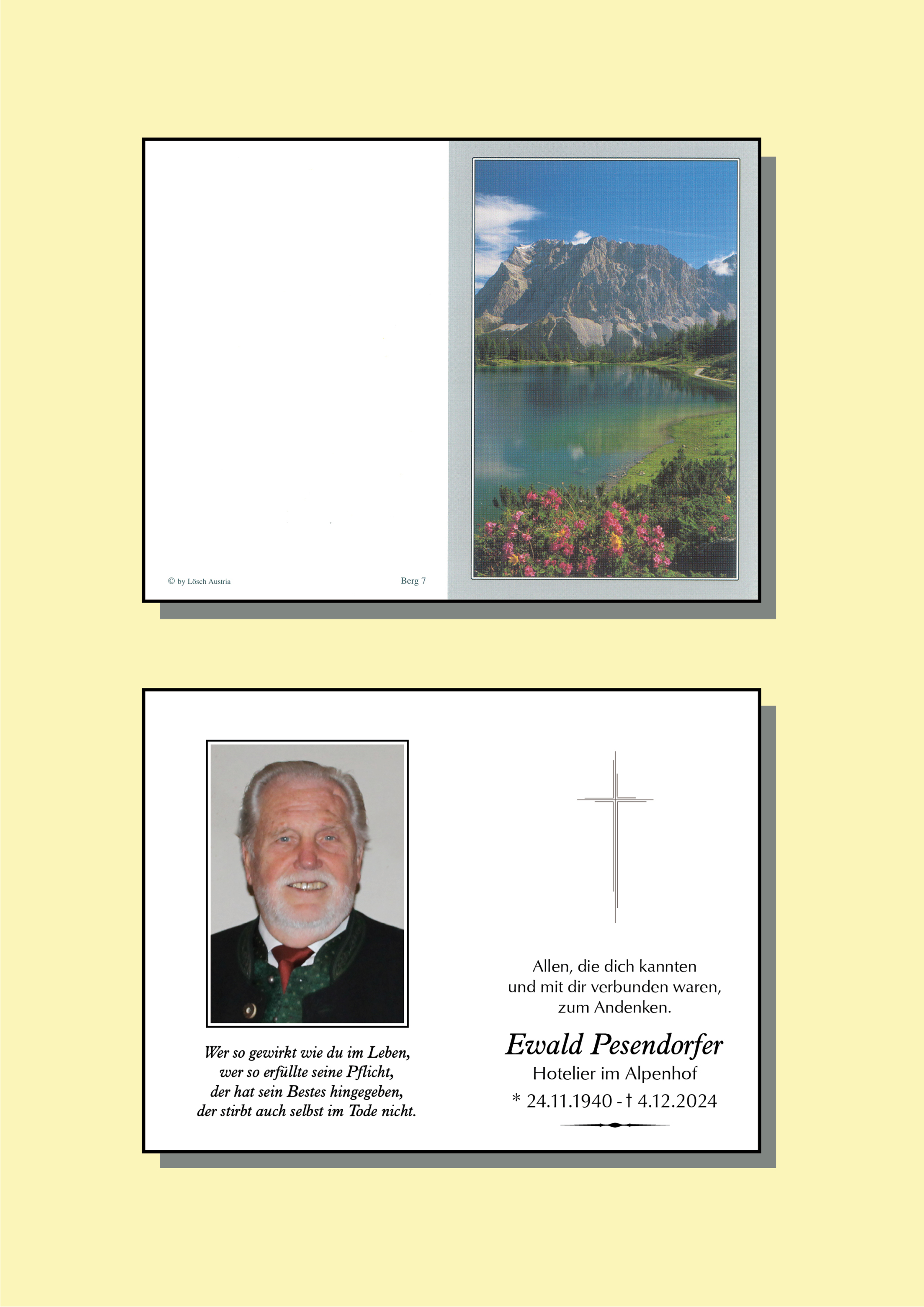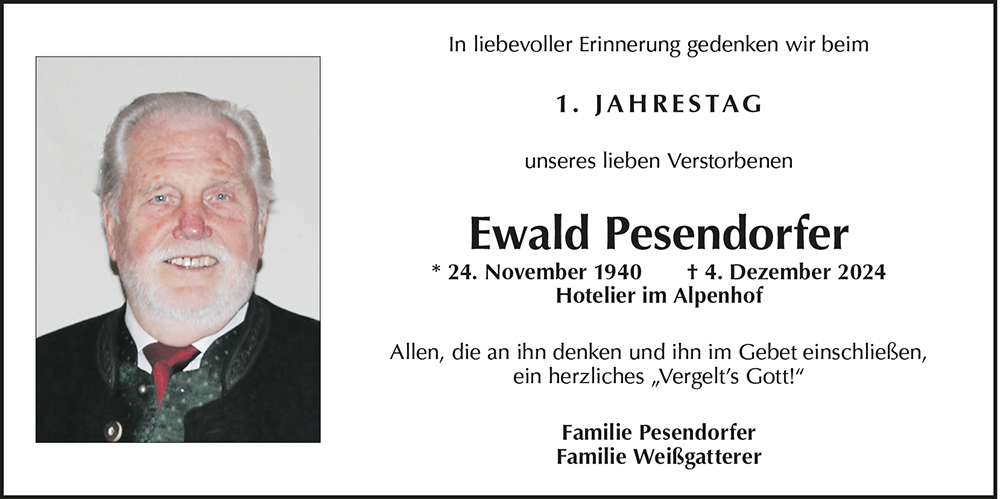 Liebe Familie Pesendorfer, auf diesem Wege möchten wir Ihrer Familie unser Beileid zum Ableben Ihres (Schwieger-)Vaters / Großvaters / Bruders aussprechen. Wir wünschen Ihnen viel Kraft, diesen Verlust zu verkraften und hoffen, dass Sie die schönen Erinnerungen an ihn in Ehren halten werden.