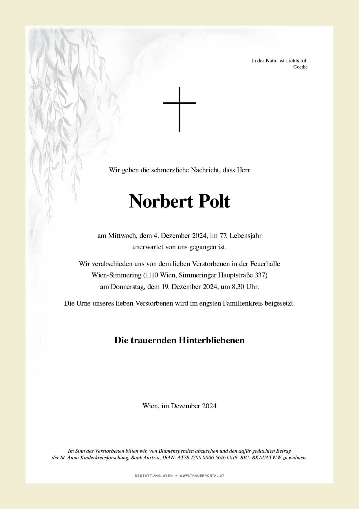 Bestattung wurde durchgeführt von: Bestattung Wien Bestattung Wien GmbH Simmeringer Hauptstraße 339 1110 - Wien (Simmering) Tel.: 01 501950 zum Bestatter